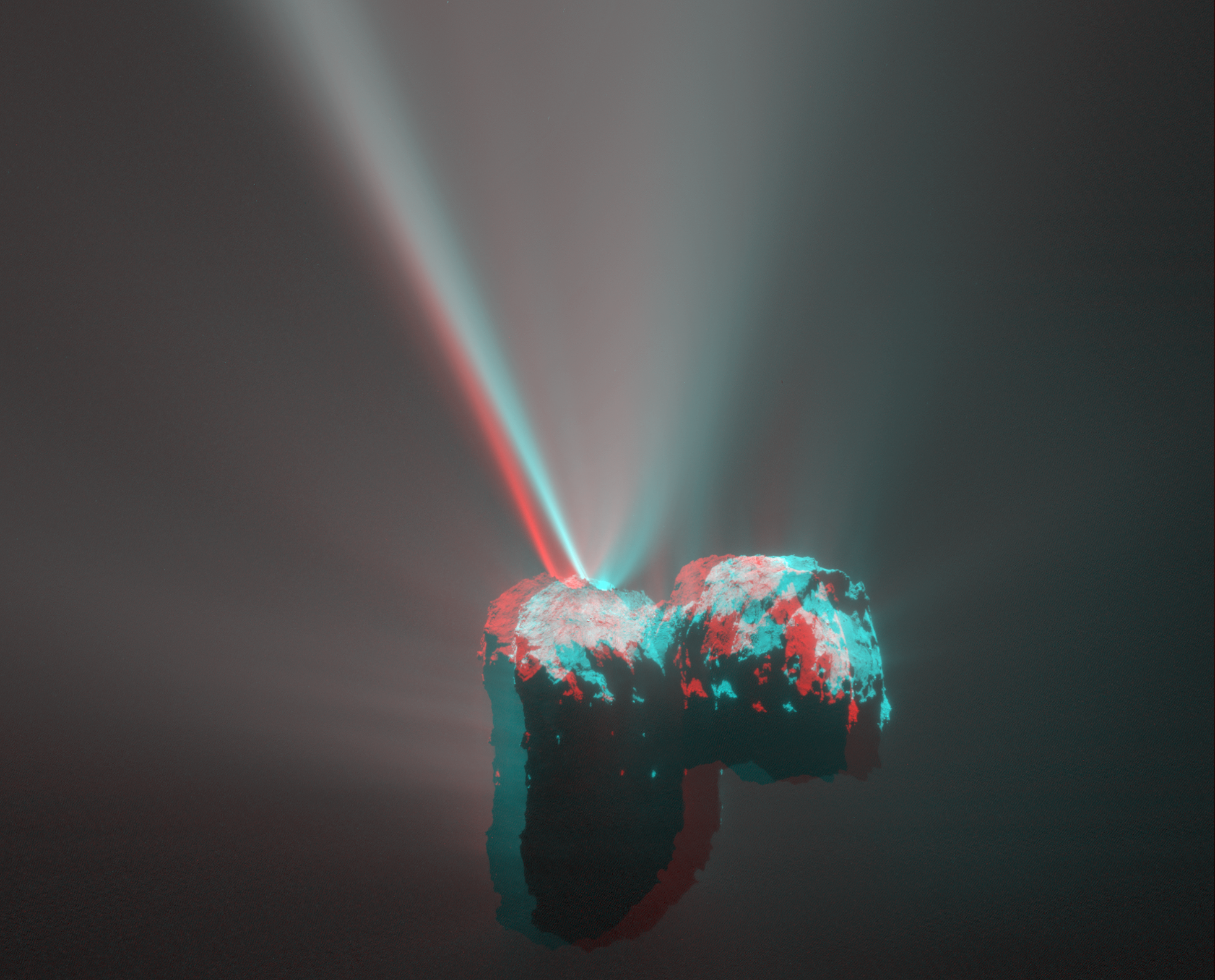 A 3D anaglyph view of Comet 67P/Churyumov-Gerasimenko based on two images acquired by Rosetta’s OSIRIS narrow angle camera on 12 August 2015, capturing a spectacular jet event. The two images are separated by 2 minutes 28 seconds, which corresponds to a stereo angle of 1.2 degrees. The image scale is 3.9 metres per pixel. In this orientation the Babi and Aker regions are visible on the large lobe to the left, while Ma’at and the circular Hatmehit depression are seen on the small lobe to the right. Diffuse dust emission and other jets are visible all around the nucleus.