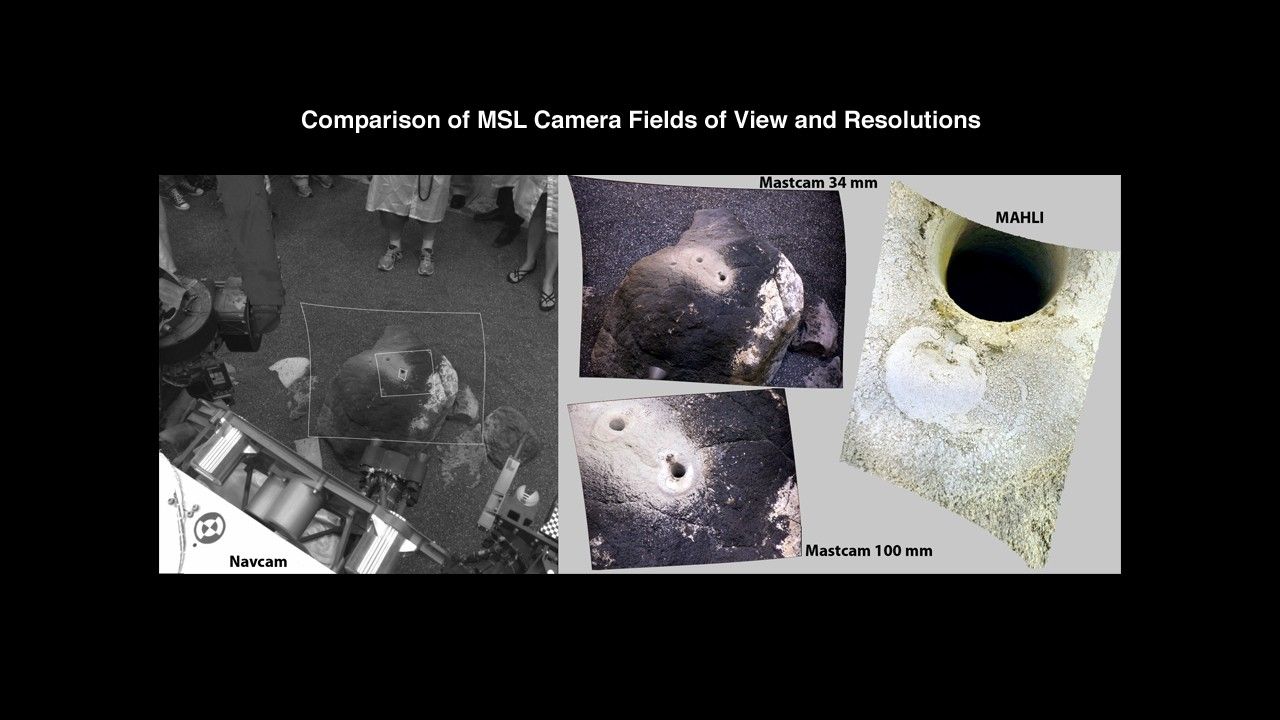 This set of images compares test images taken by four cameras on NASA's Curiosity rover at NASA's Jet Propulsion Laboratory before launch. The image on the left shows a view from one of the black-and-white Navigation Cameras on the mast of Curiosity, looking down at the ground. The Navigation Cameras have a wider field of view (about 45 degrees) than the Mast Cameras (15 and 5 degrees) seen in the center of the figure, and Mars Hand Lens Imager (23 degrees), whose picture of the rock target is on the right. The outlines of the Mastcam and MAHLI images are shown superimposed on the Navcam image.
