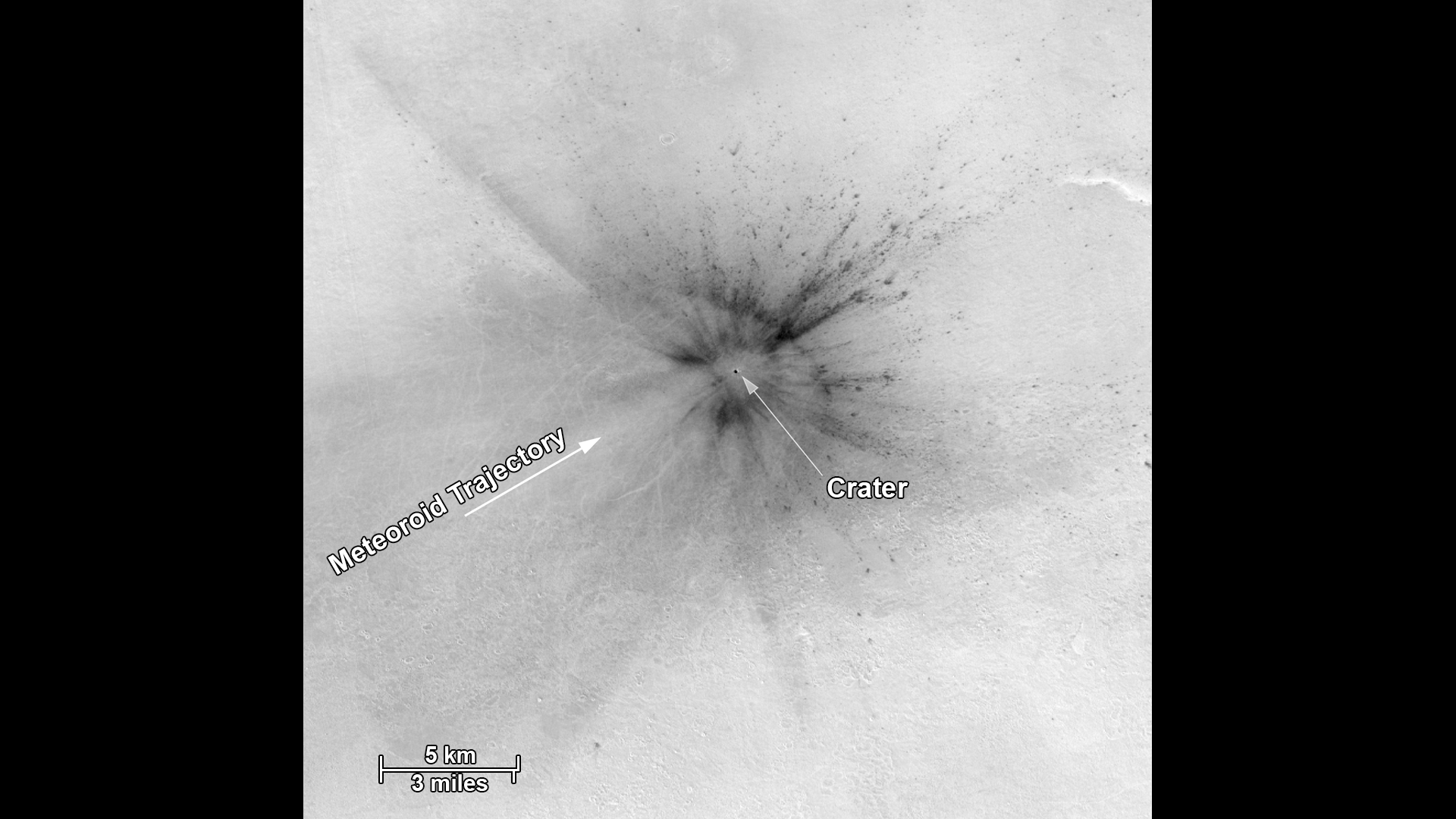 Looking closely at the crater’s rim, white specks could be detected that suggested the presence of water ice (which was later confirmed by MRO’s High-Resolution Imaging Science Experiment, or HiRISE, camera). Debris thrown during the impact can be seen reaching as far as 23 miles (37 kilometers) away. The disturbance seen in the surface suggests the meteoroid was traveling towards the northeast when it hit the ground, throwing the longest streaks of debris in that direction.