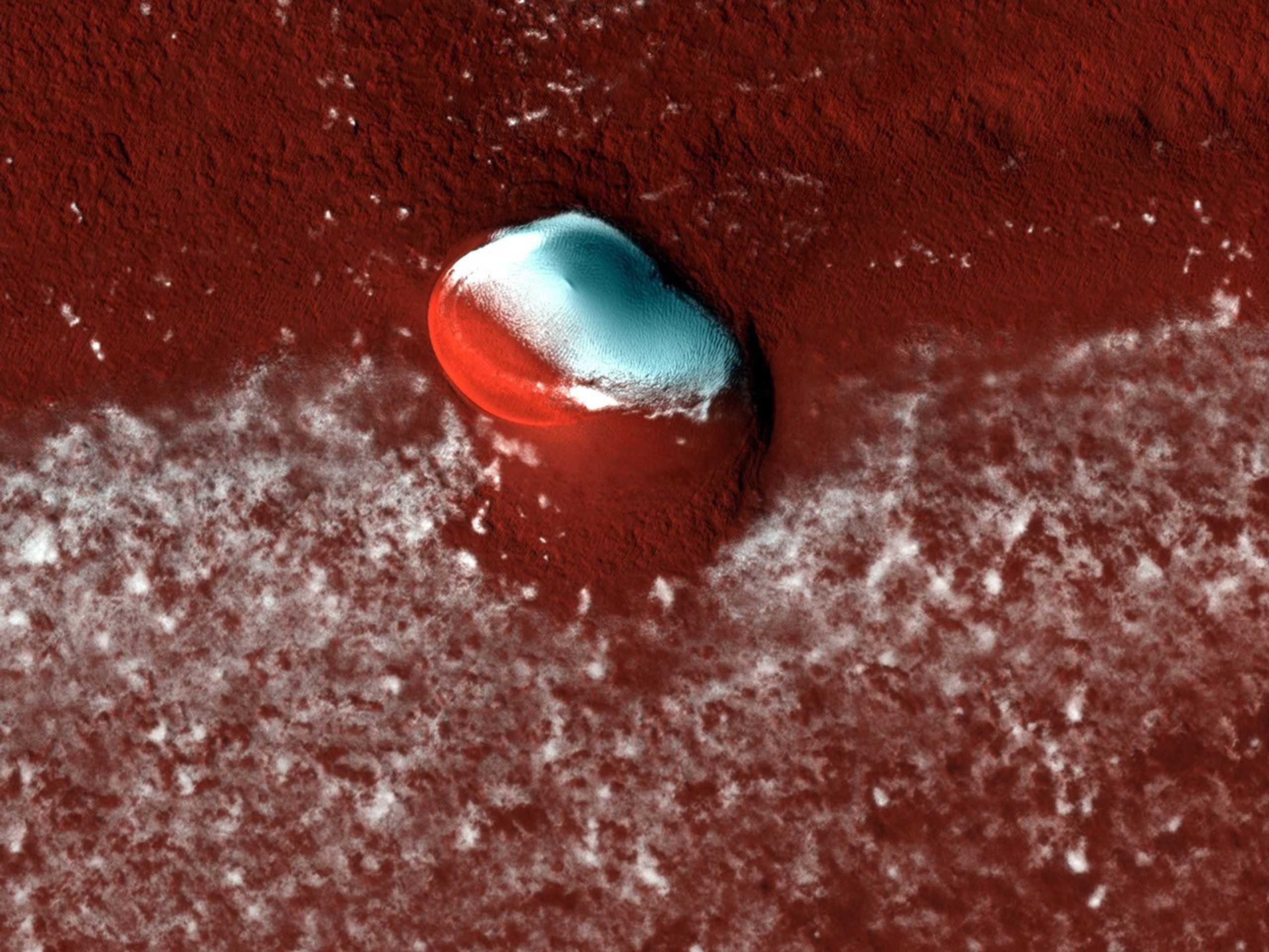 HiRISE is enabling a more detailed study of these polar craters and the target of this observation is visible in the center of the image. This crater proved to be a surprise in a few ways. Its shape is non-circular which is quite unusual for an impact crater. One possibility is that flow of the ice beneath the surrounding terrain has deformed the crater; however, ice-flow rates are thought to be very low on Mars today.