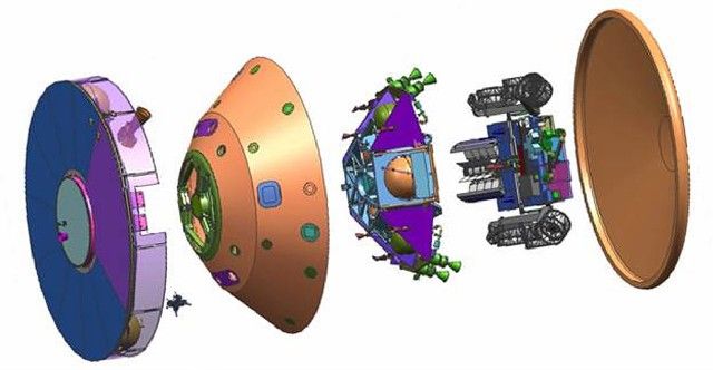 The Mars Science Laboratory flight system will consist of four major elements in three distinct phases (from left): the cruise stage, the aeroshell (heatshield and backshell), the descent stage, and the rover.