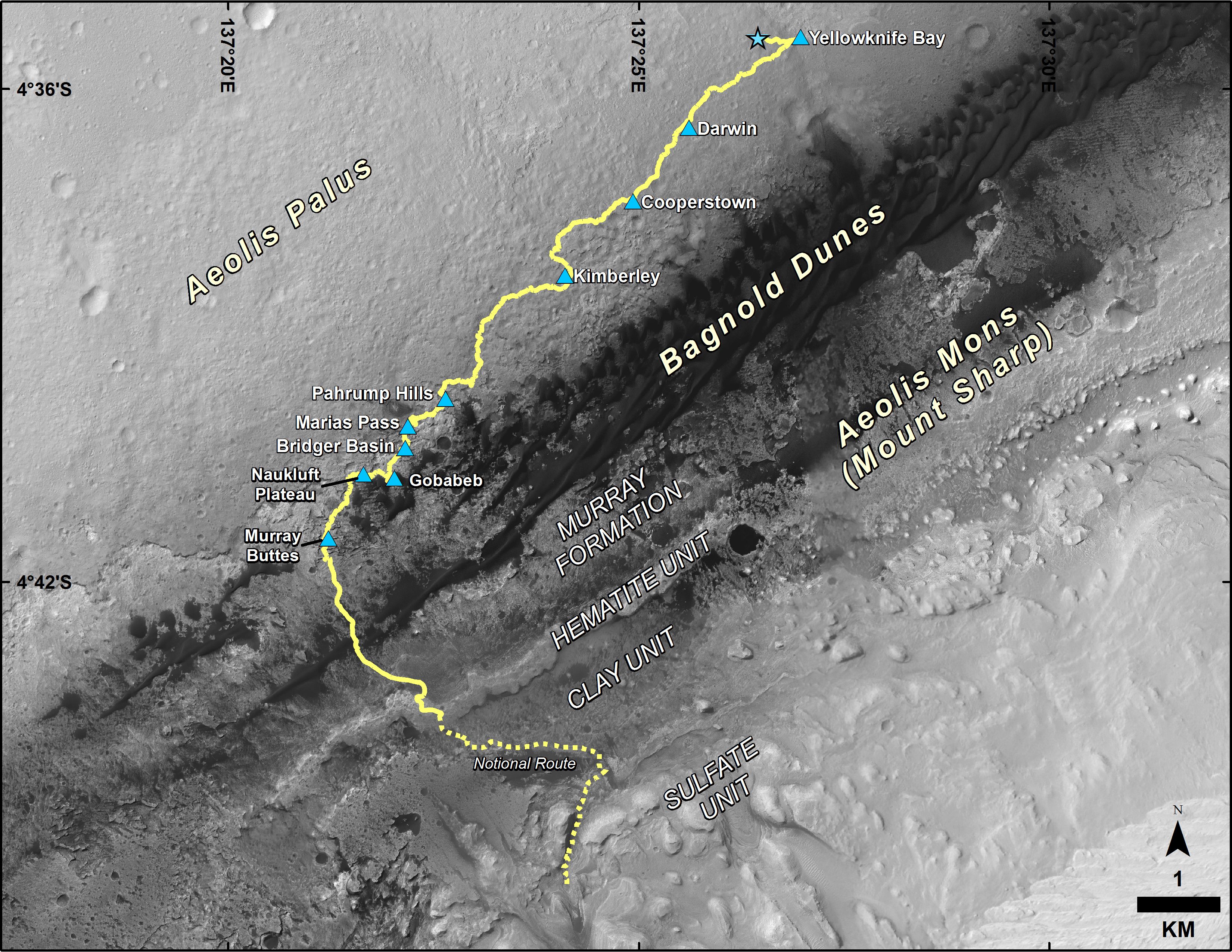 The base image for the map is from the High Resolution Imaging Science Experiment (HiRISE) camera on NASA's Mars Reconnaissance Orbiter. North is up. Bagnold Dunes form a band of dark, wind-blown material at the foot of Mount Sharp.
