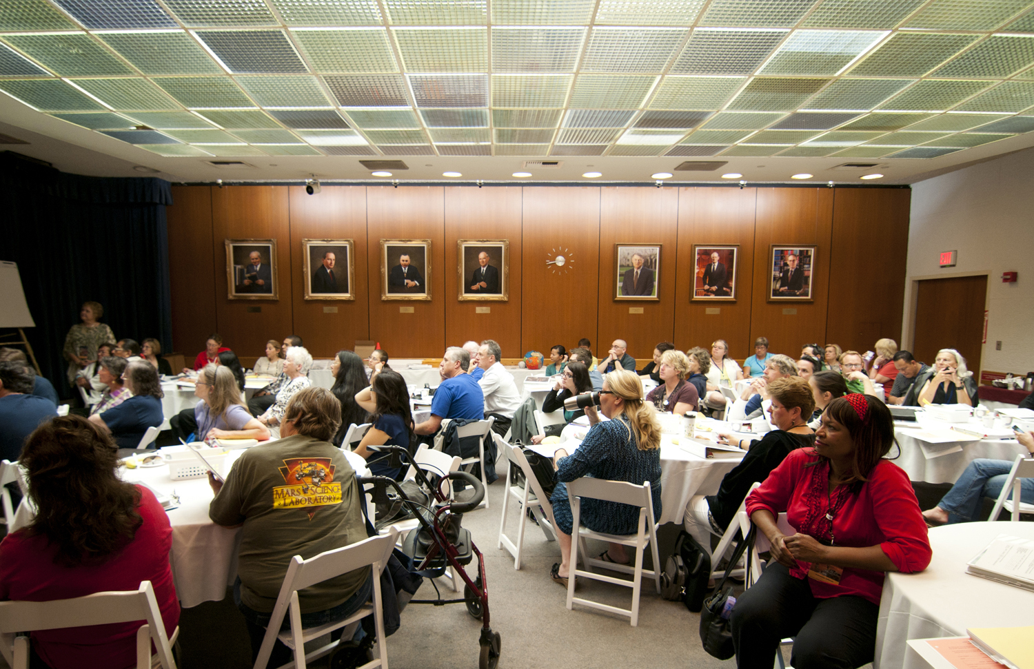 Teachers gather at NASA’s Jet Propulsion Laboratory (JPL) in Pasadena, Calif., for the Curiosity Landing Educator Workshop. They hear about the weekend’s schedule sitting below portraits of JPL’s present and former directors.