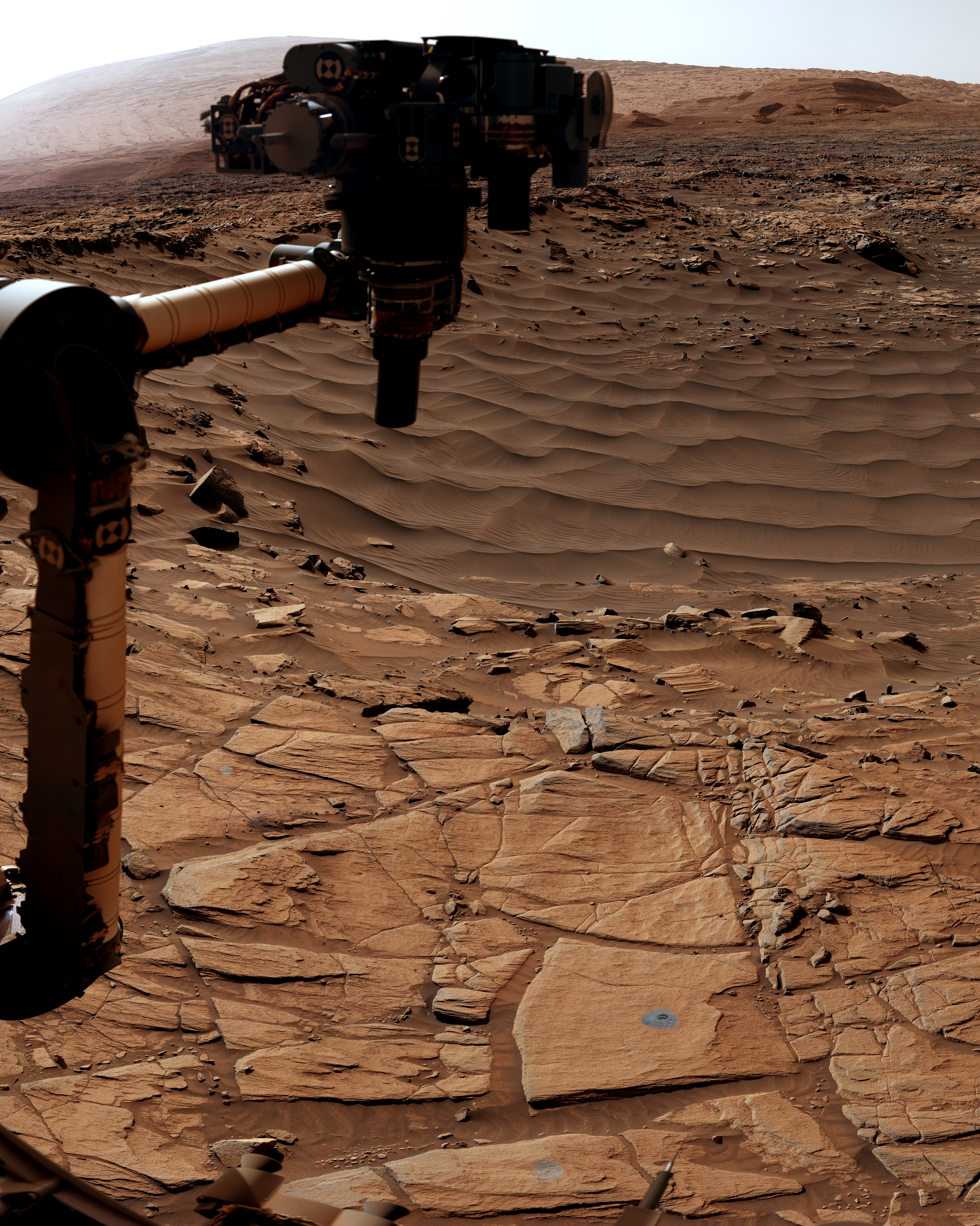 The scene was captured while Curiosity was parked on top of a feature called the “Greenheugh Pediment.” Looming above in the background is the top of Mount Sharp, the 3-mile-tall (5-kilometer-tall) mountain that Curiosity has been ascending since 2014.