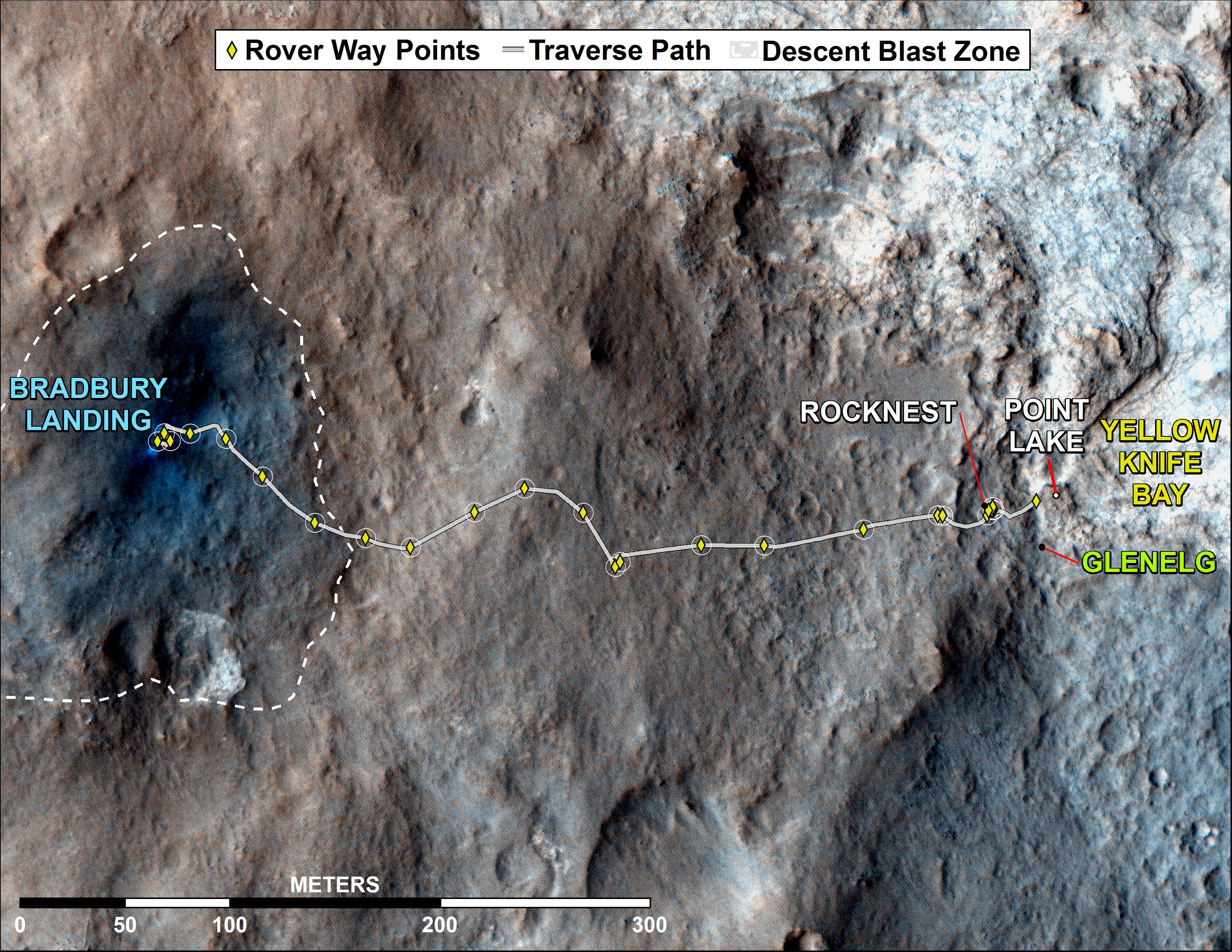 This map shows where NASA's Mars rover Curiosity has driven since landing at a site subsequently named "Bradbury Landing," and traveling to an overlook position near beside "Point Lake," in drives totaling 1,703 feet (519 meters). The rover landed on Aug. 5 Pacific Time (Aug. 6, Universal Time). It was at the easternmost waypoint on this map on Nov. 30, 2012. It worked on scoops of soil for a few weeks at the drift of windblown sand called "Rocknest." The place called "Glenelg" is where three types of terrain meet. The depression called "Yellowknife Bay" is a potential location for selecting the first target rock for Curiosity's hammering drill.