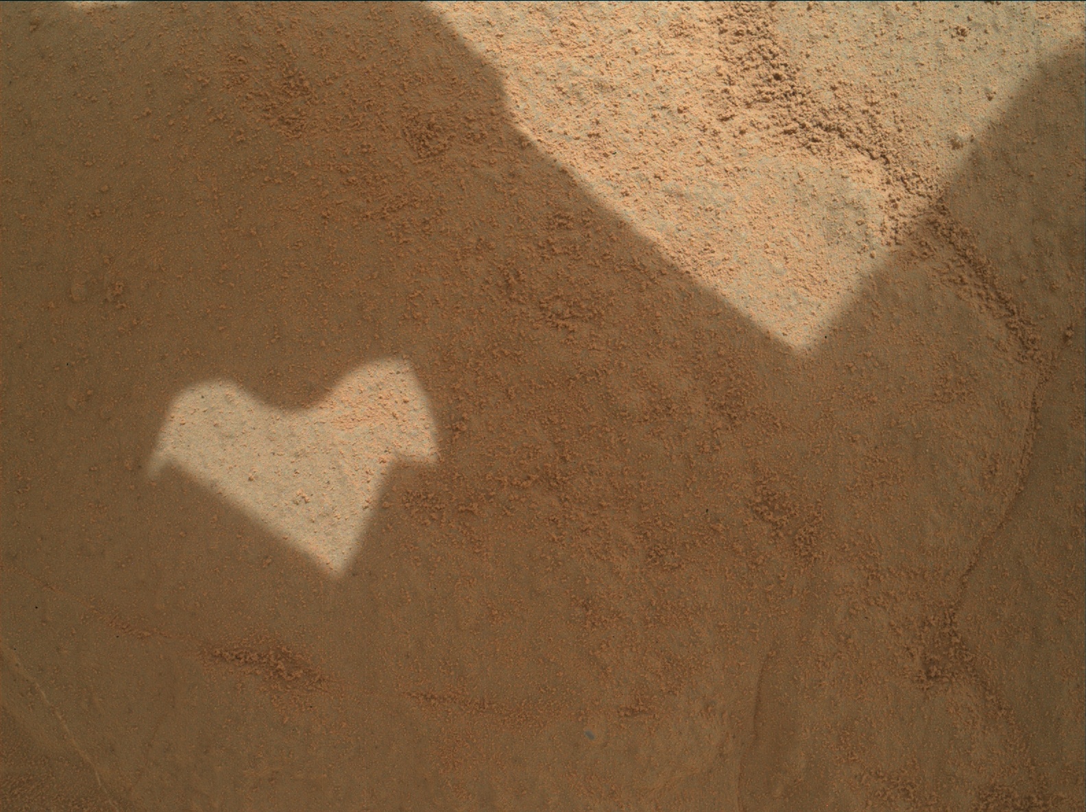 A cheerful patch of heart-shaped sunlight reminds us of how we love learning about Mars! Curiosity took this image using its Mars Hand Lens Imager (MAHLI), located on the turret at the end of the rover's robotic arm, on December 16, 2012, or Sol 129 of her mission.