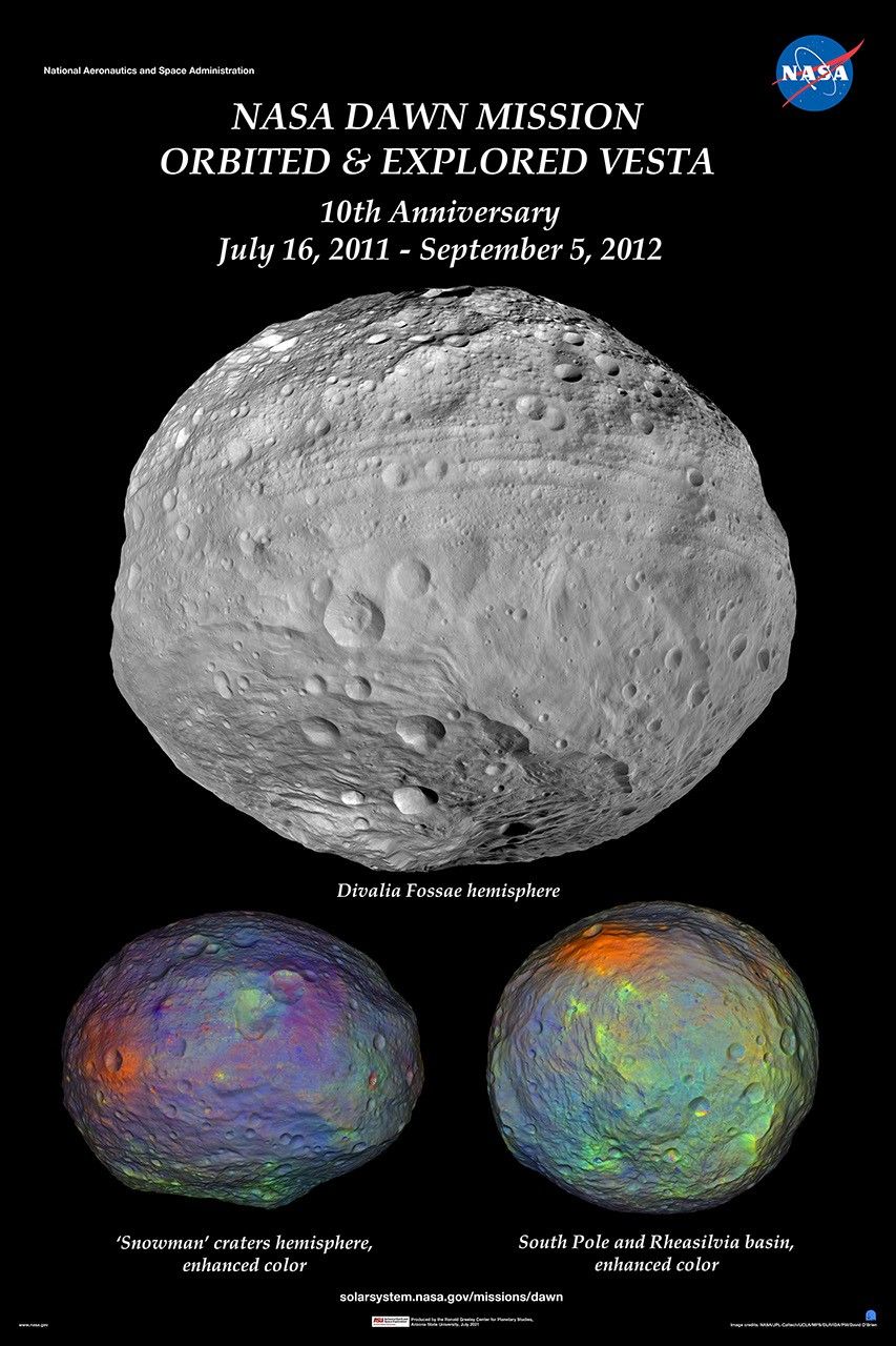 This poster shows multiple views of Vesta obtained by Dawn’s German-built camera. The large central black-and-white photomosaic, constructed from many small images, shows an equatorial view centered on the hemisphere with a series of Grand Canyon-sized ridges and grooves that run parallel to its equator, named the Divalia Fossae.