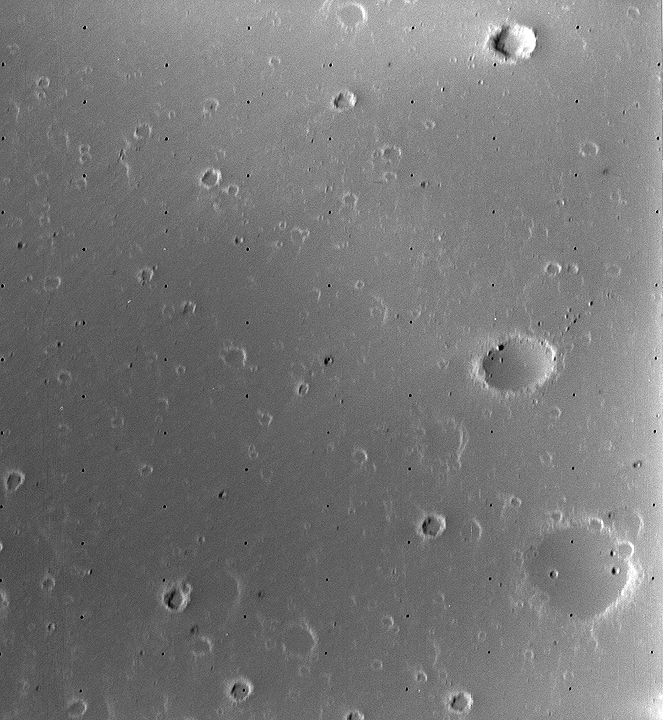 Close-up image of Mars' satellite Deimos from the Viking 2 Orbiter showing craters and associated streaks. The streaks run from upper right to lower left, and may have been formed by the base surge "wind" of an impacting meteoroid. The image is about 1.3 km across and north is at 11:30.