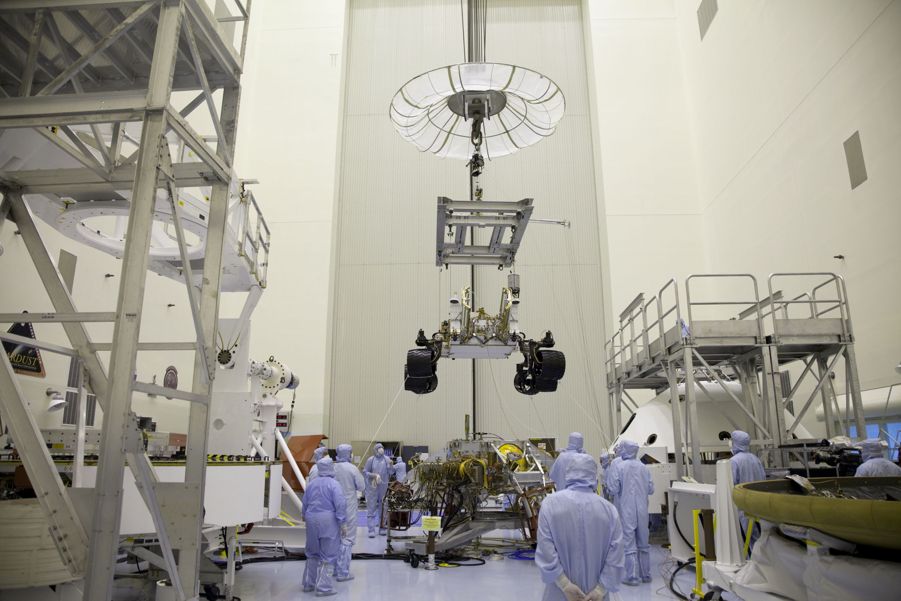 Cape Canaveral, Fla. -- Technicians, at the Payload Hazardous Servicing Facility at NASA's Kennedy Space Center in Florida, use an overhead crane to move NASA's Mars Science Laboratory (MSL) rover, known as Curiosity, to the high bay floor where the instrument mast and science boom will undergo deployment testing. A United Launch Alliance Atlas V-541 configuration will be used to loft MSL into space. Curiosity's 10 science instruments will search for habitable environments on Mars that could support life, past or present. The unique rover will use a laser to look inside rocks and release the gasses so that its spectrometer can analyze and send the data back to Earth, as well as sophisticated chemistry experiments and high-powered microscopes. MSL is scheduled to launch from Cape Canaveral Air Force Station in Florida Nov. 25. For more information visit: www.nasa.gov/msl.