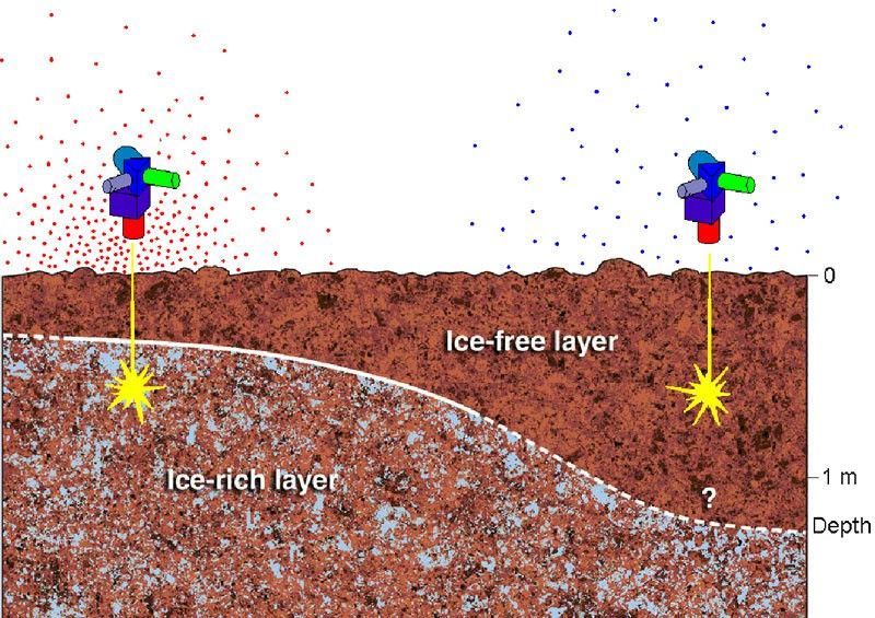 Water, whether liquid or frozen, absorbs neutrons more than other substances. The Detector of Albedo Neutrons on the Mars Science Laboratory rover will use this characteristic to search for subsurface ice on Mars.