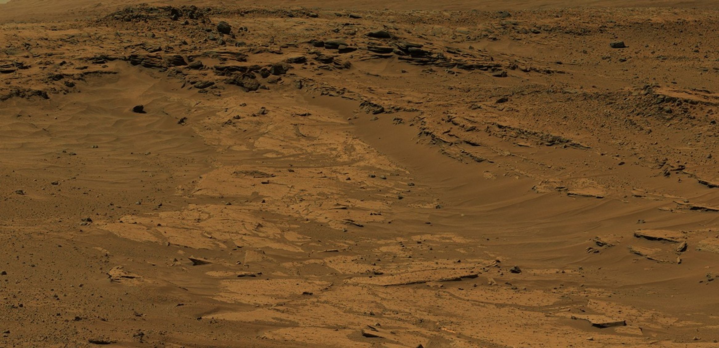 Sandstone layers with varying resistance to erosion are evident in this Martian scene recorded by the Mast Camera (Mastcam) on NASA's Curiosity Mars rover. The component images were taken by the Mastcam's left-eye camera shortly before midday of the 553rd Martian day, or sol, of the rover's work on Mars (Feb. 25, 2014). The location is about one-quarter mile (about 400 meters) north-northwest of a planned waypoint called "the Kimberley," by straight-line distance, longer by driving distance.