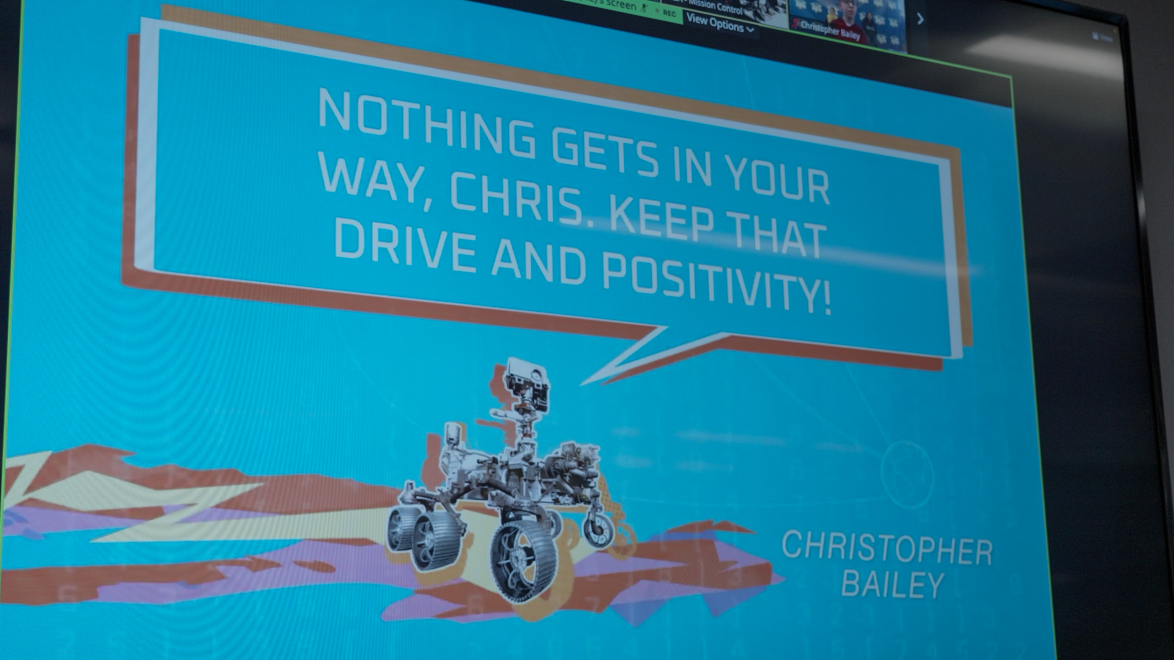 This is one of 11 digital messages beamed from Mars to students who have overcome academic challenges, on April 4, 2023. This greeting was presented during a live webinar from the rover's mission control area at NASA's Jet Propulsion Laboratory in Southern California, as part of the ongoing "You've Got Perseverance" campaign.