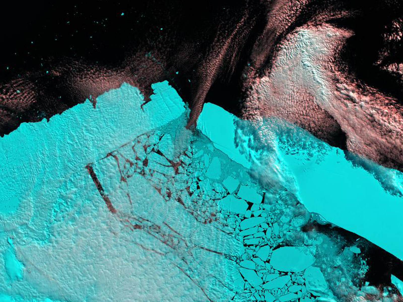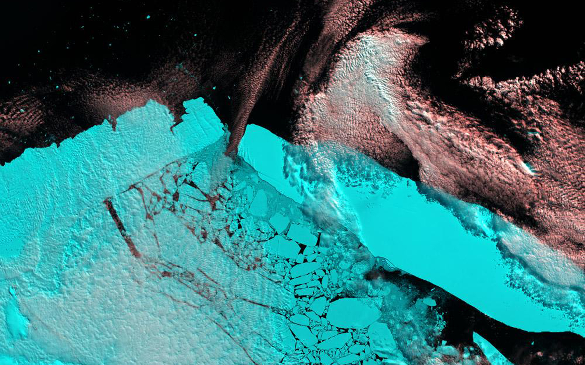 This image, taken on January 21, 2005, shows a collision between two of the largest floating objects in the world, the Drygalski Ice Tongue and iceberg "B15-A" in Antarctica (B15-A is on the right). The 43-mile- (70-kilometer-) long Drygalski Ice Tongue juts out from the icy land of Antarctica into McMurdo Sound like a pier, and is a floating extension of the land-based David Glacier. B15-A, 75 miles (120 kilometers) long, had been drifting slowly towards Drygalski for months before this image was taken. The presence of B15-A complicated supply trips to the nearby McMurdo science base and endangered penguins in the area by blocking their access to open sea. The perspective we get from space allows us to see the scale and scope of changes to these massive bodies of ice that we could not see in any other way.