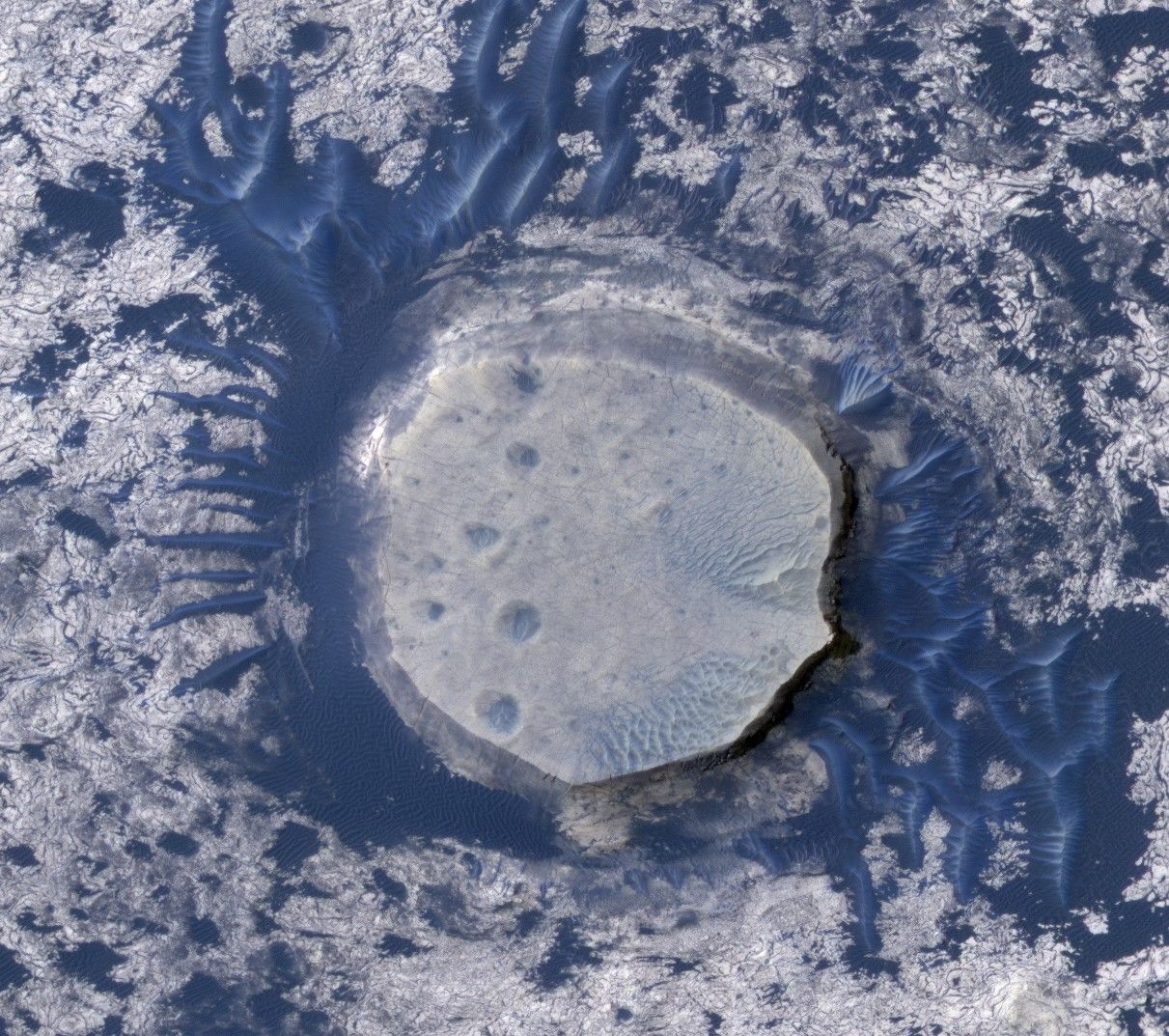 This view of an inverted crater in the Arabia Terra region of Mars is among the images taken by NASA's Mars Reconnaissance Orbiter in early 2010 as the spacecraft approached the 100-terabit milestone in total data returned.