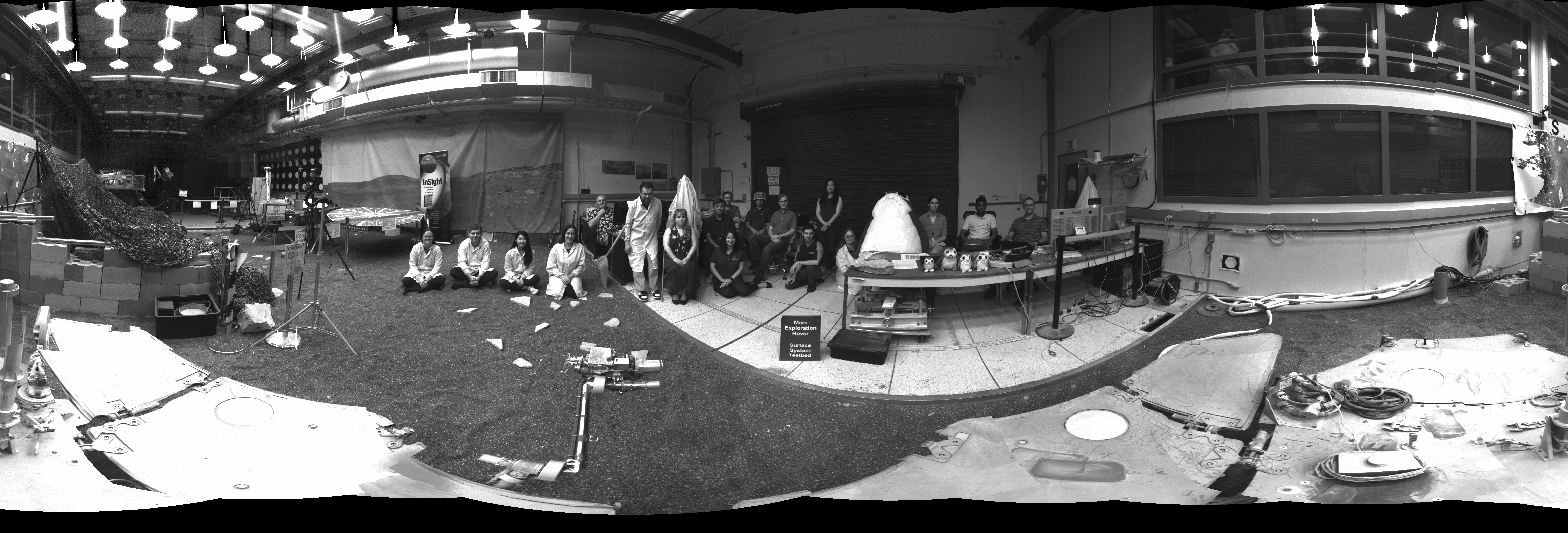 This 360-degree panorama was taken by "Dusty," a fully-working replica of NASA's Opportunity rover at the agency's Jet Propulsion Laboratory. The panorama was taken as part of a software test. Members of the Opportunity team gathered to sit in during the panorama.