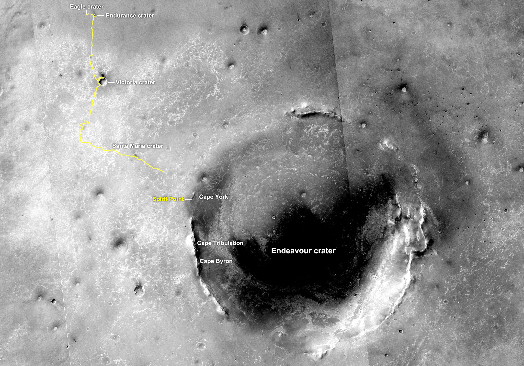The yellow line on this map shows where NASA's Mars Rover Opportunity has driven from the place where it landed in January 2004 -- inside Eagle crater, at the upper left end of the track -- to a point about 2.2 miles (3.5 kilometers) away from reaching the rim of Endeavour crater.