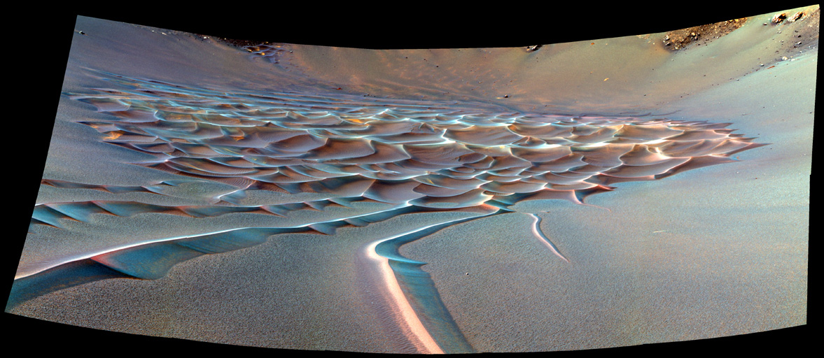 As Opportunity crept farther into "Endurance Crater," the dune field on the crater floor appears even more dramatic, as seen in this false-color image.
