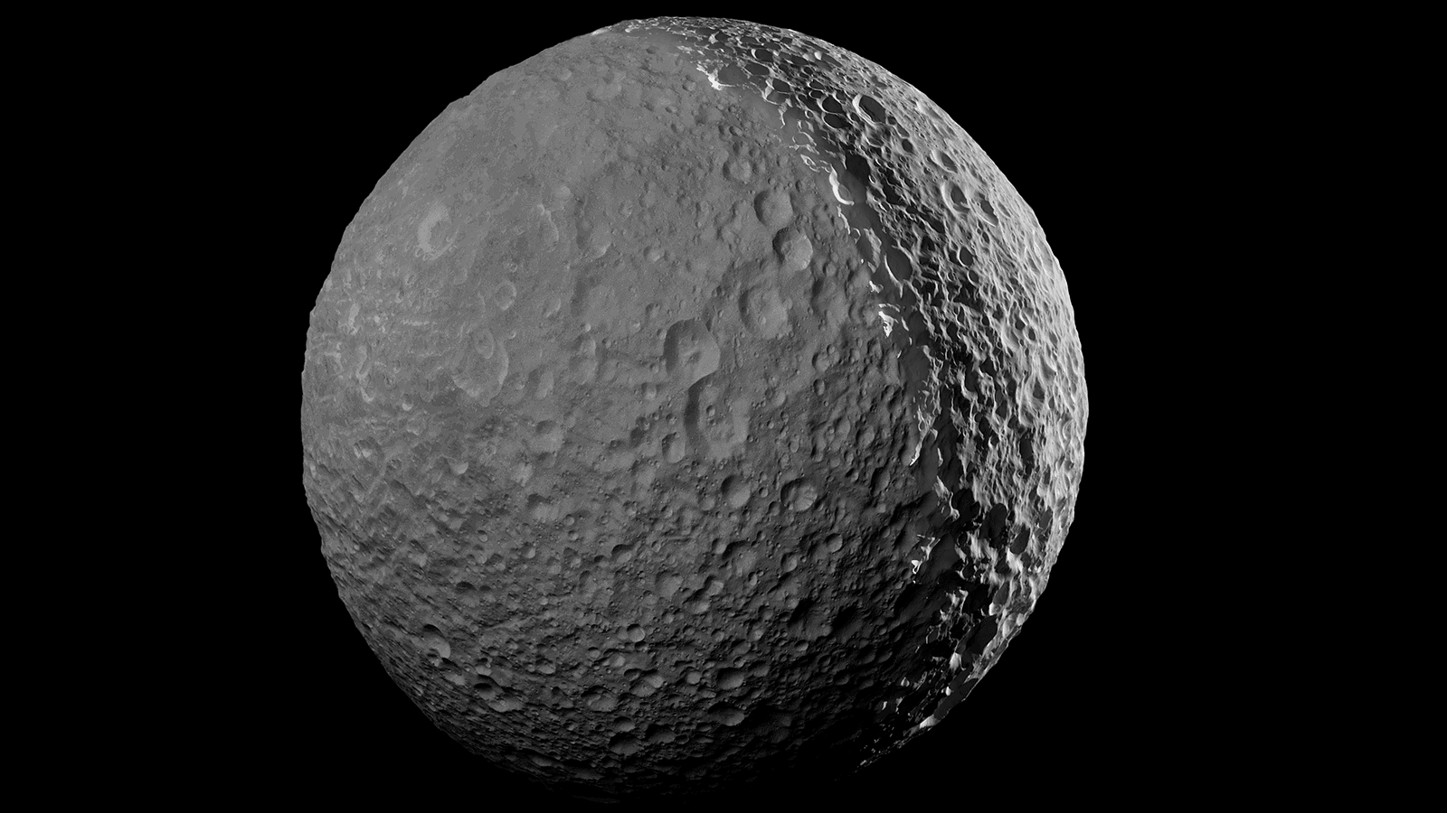 Mimas' surface is pockmarked with countless craters, the largest of which gives the icy moon its distinctive appearance. (See PIA12568 for more info on Mimas' distinctive crater, Herschel.)