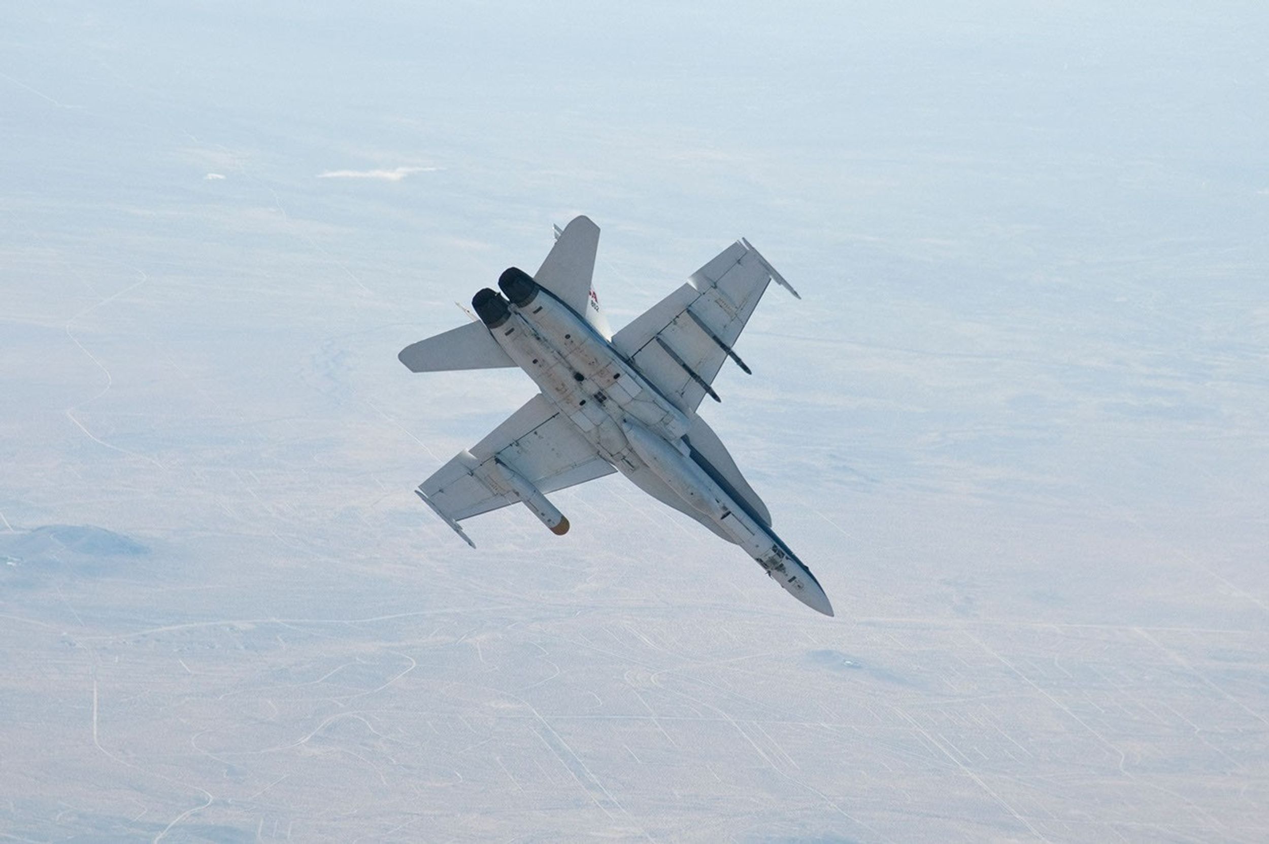 A NASA Dryden Flight Research Center F/A-18 852 aircraft performs a roll during a dive toward Rogers Dry Lake at Edwards Air Force Base, Calif., during June 2011 flight tests of a Mars landing radar. A test model of the landing radar for NASA's Mars Science Laboratory mission is inside a pod under the aircraft's left wing.