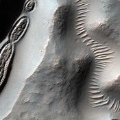 This image from NASA's Mars Reconnaissance Orbiter is a close-up of a trough, along with channels draining into the depression. Some HiRISE images show strange-looking formations. Sometimes it helps to look at Context Camera images to understand the circumstances of a scene -- like this cutout from CTX 033783_1509 -- which here shows an impact crater with a central peak, and a collapse depression with concentric troughs just north of that peak.