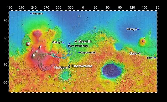 The locations of these four candidates are indicated here on a background map of color-coded topographical data from the Mars Orbiter Laser Altimeter on NASA's Mars Global Surveyor. Red is higher elevation; blue is lower elevation. In latitude, the map extends from 70 degrees (north) to minus 70 degrees (south). The east-west axis is labeled at the top in degrees of east longitude, with the zero meridian at the center.