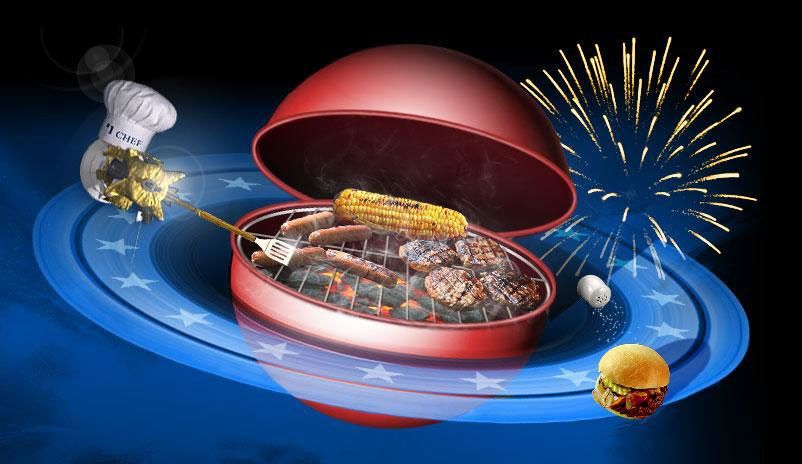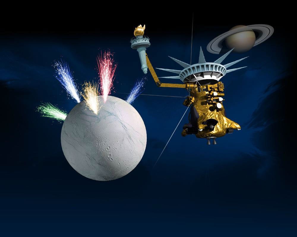 Cassini and Enceladus decorated with Fourth of July artwork.