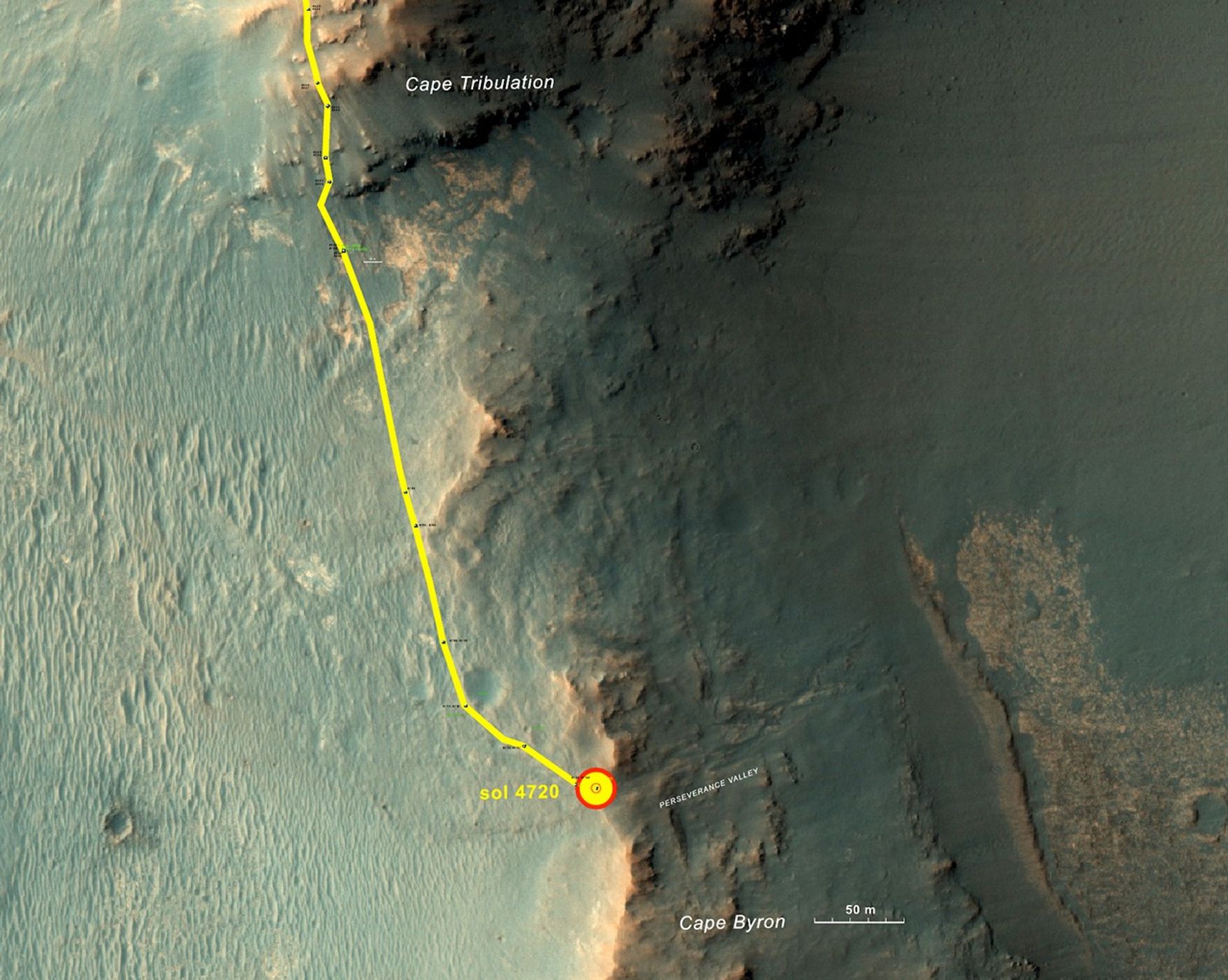 The map covers an area about four-tenths of a mile (two-thirds of a kilometer) wide, with the interior of the crater on the right. Opportunity entered this mapped area from the north along the gold traverse line on March 21, 2017, approaching the southern tip of the "Cape Tribulation" segment of Endeavour's rim. It reached the top of "Perseverance Valley" with a drive on Sol 4720 (the 4,720th Martian day) of the mission, on May 4, 2017.