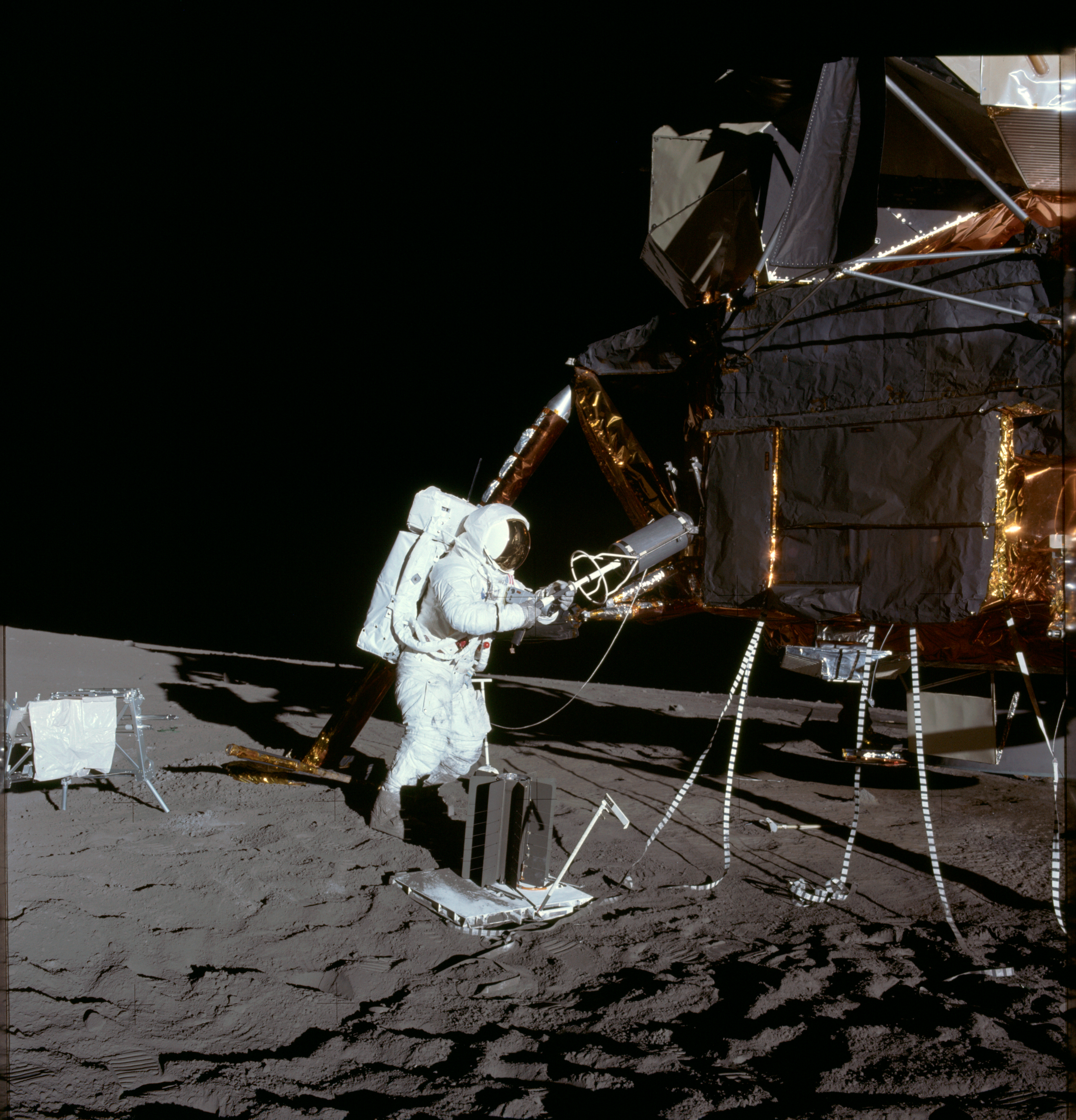 Apollo 12 astronaut Alan Bean extracts the fuel element of a radioisotope thermoelectric generator (RTG) from storage on the lunar module on the Moon. The RTG was used to power the Apollo Surface Experiment Package (ALSEP).