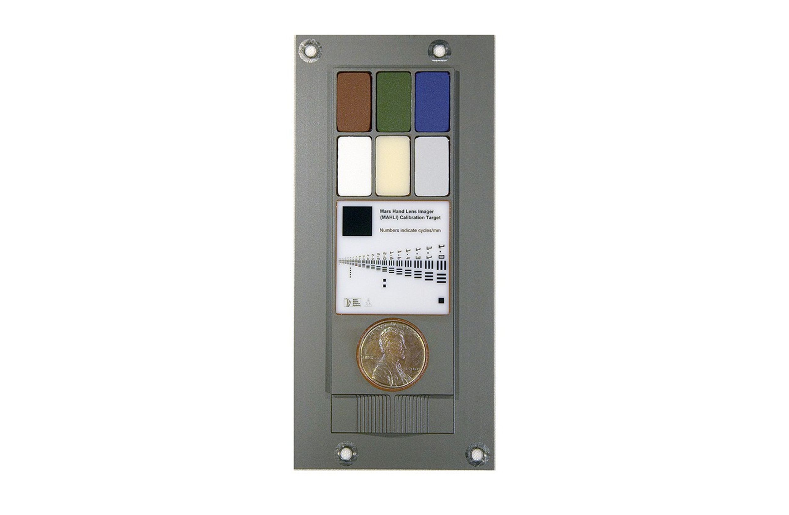 The MAHLI calibration target includes color chips, a metric standardized bar graphic, a penny, and a stair-step pattern for depth calibration. The MAHLI adjustable-focus, color camera is one of the tools on the turret at the end of Curiosity's robotic arm. Its calibration target is attached to the rover at the arm's shoulder joint.