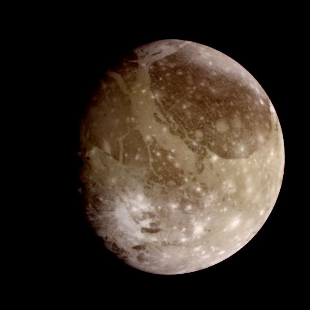This natural color view of Ganymede was taken from the Galileo spacecraft during its first encounter with the satellite. The dark areas are the older, more heavily cratered regions and the light areas are younger, tectonically deformed regions. The brownish-gray color is due to mixtures of rocky materials and ice. Bright spots are geologically recent impact craters and their ejecta.