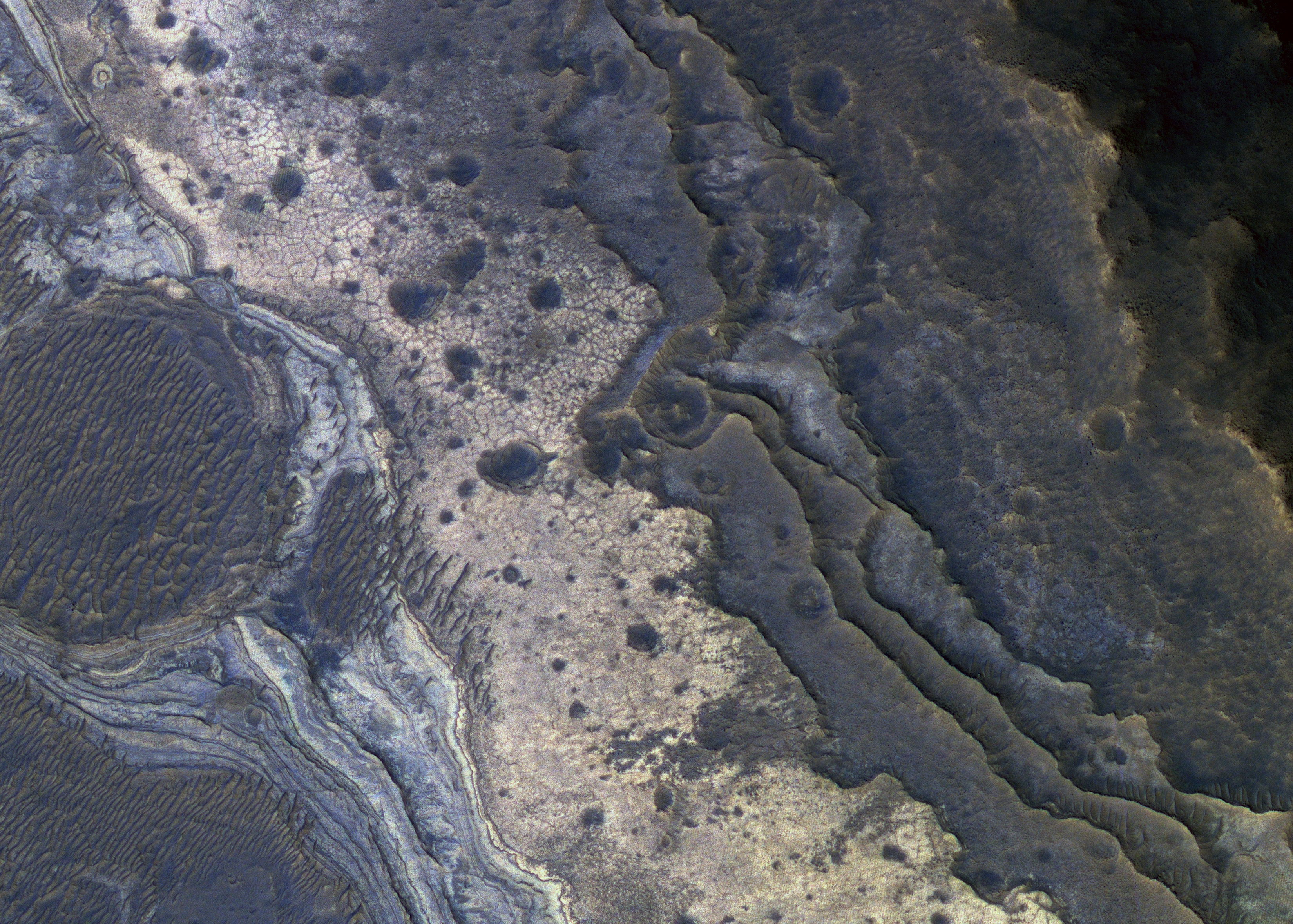 This image shows layers of rock stacked like a staircase, their edges extending diagonally from top left to bottom right and stepping downward from the lower left to the top right. At the far left of the image is an eroded, round crater filled with a row of nearly parallel sand dunes. To the right of the crater, a pinkish-colored layer of light-toned rock within the staircase contains opal.