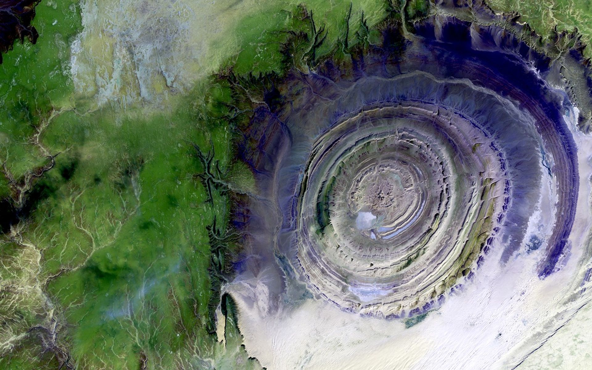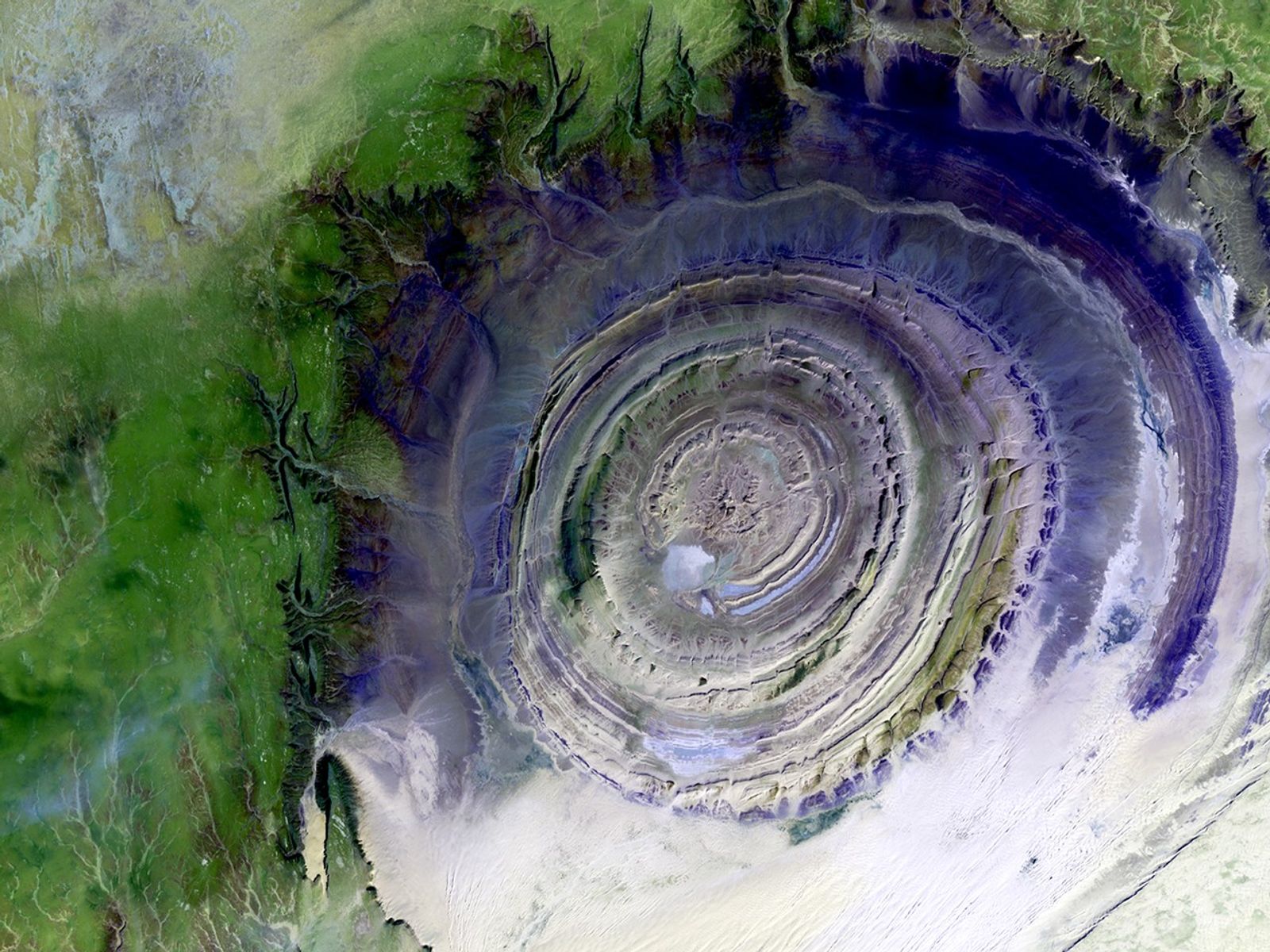 This beautiful image, taken on 11 January 2001, shows a geological formation in the Maur Adrar Desert in Mauritania, Africa. Known as the "Richat Structure," this snail-shell-like formation was created when a volcanic dome hardened and gradually eroded, exposing onion-like layers of rock.