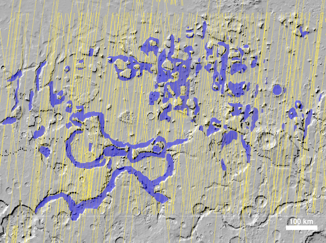 This map of a region known as Deuteronilus Mensae, in the northern hemisphere, shows locations of the detected ice deposits in blue. The yellow lines indicate ground tracks of the radar observations from multiple orbits of the spacecraft.
