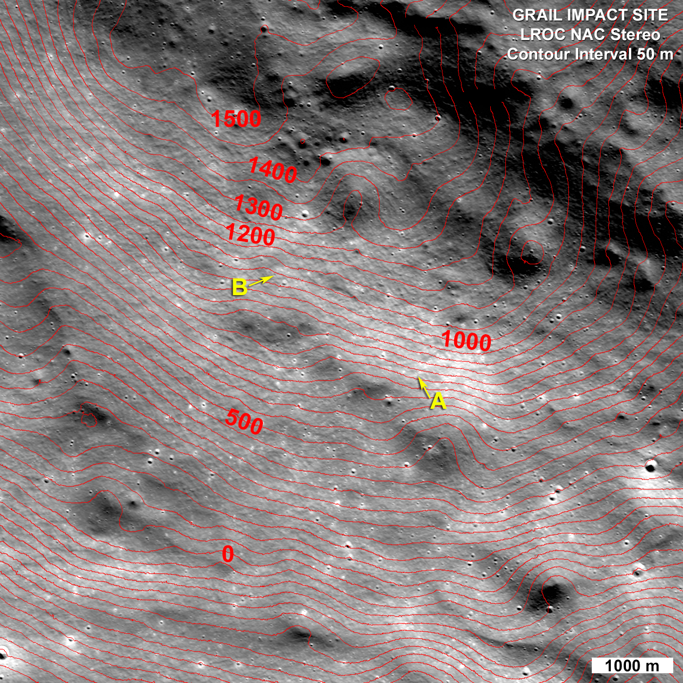 From the stereo model latitude, longitude and elevation were derived for each impact crater: GRAIL A 75.609°N, 333.407°E, 750 meters and for GRAIL B 75.651°N, 333.168°E, 1040 meters. The local slope of the mountain at the point of impact was 23° for GRAIL A and 19° for GRAIL B. The two impact craters are about 2210 m apart; GRAIL B impacted about 20 seconds after GRAIL A at a site to the northwest of GRAIL A.