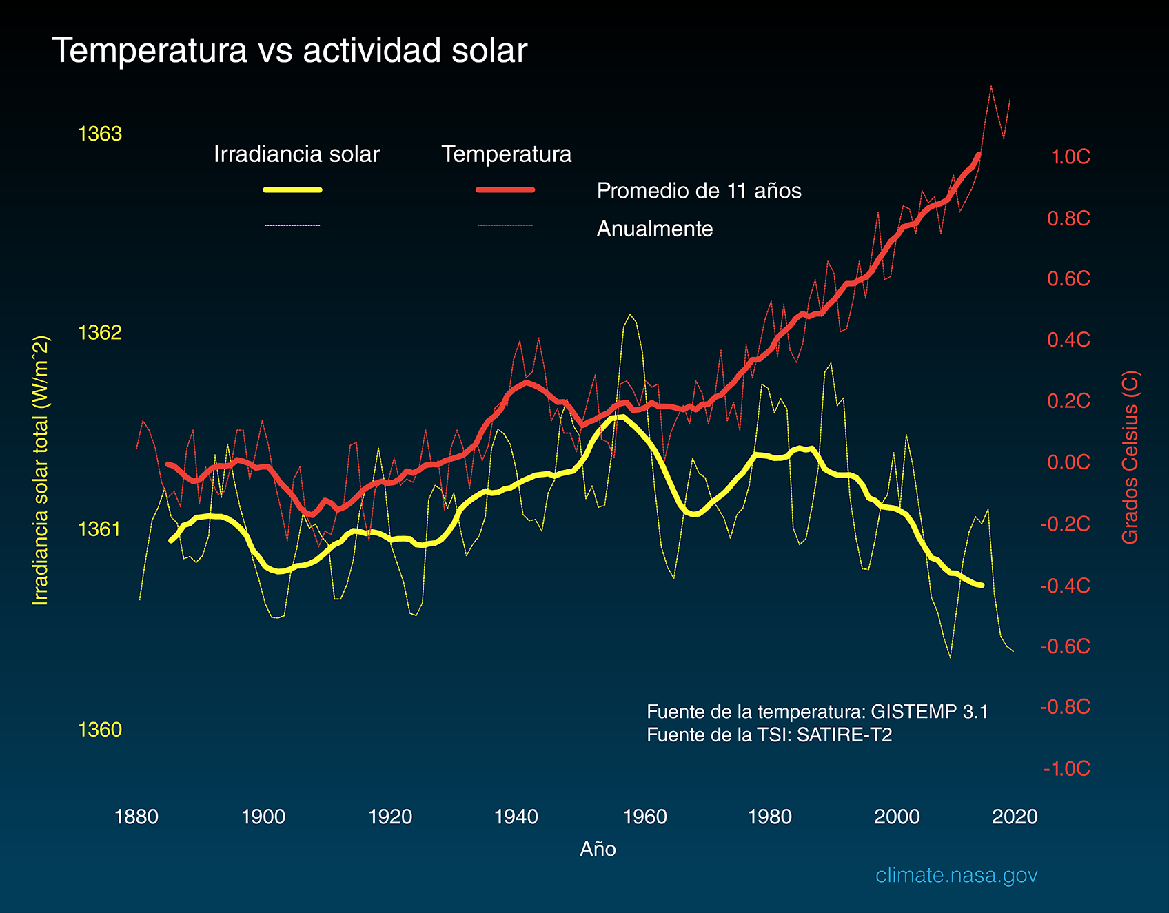 The amount of solar energy Earth receives has followed the Sun’s natural 11-year cycle of small ups and downs, with no net increase since the 1950s. Over the same period, global temperature has risen markedly. It is therefore extremely unlikely that the Sun has caused the observed global temperature warming trend over the past half-century.