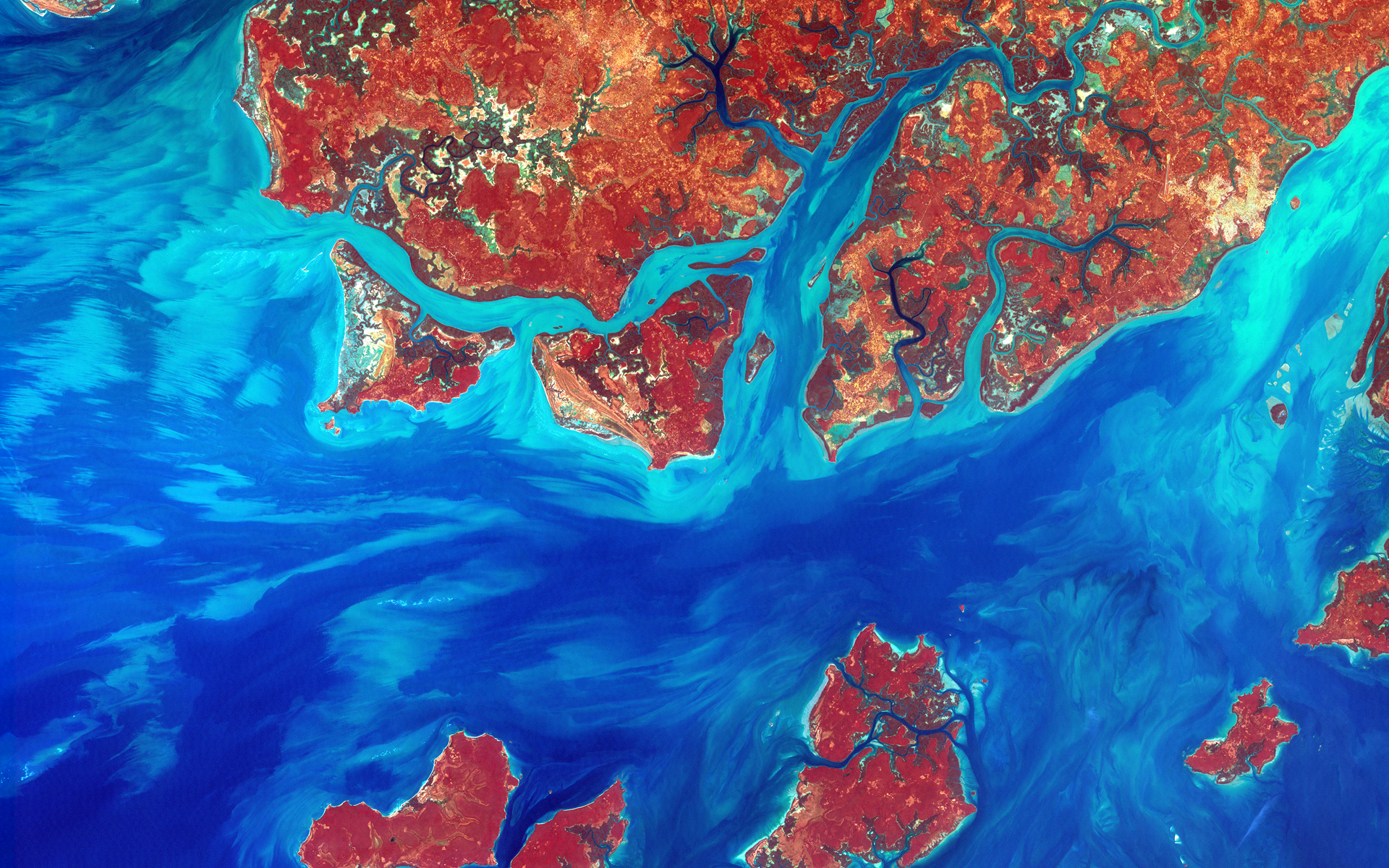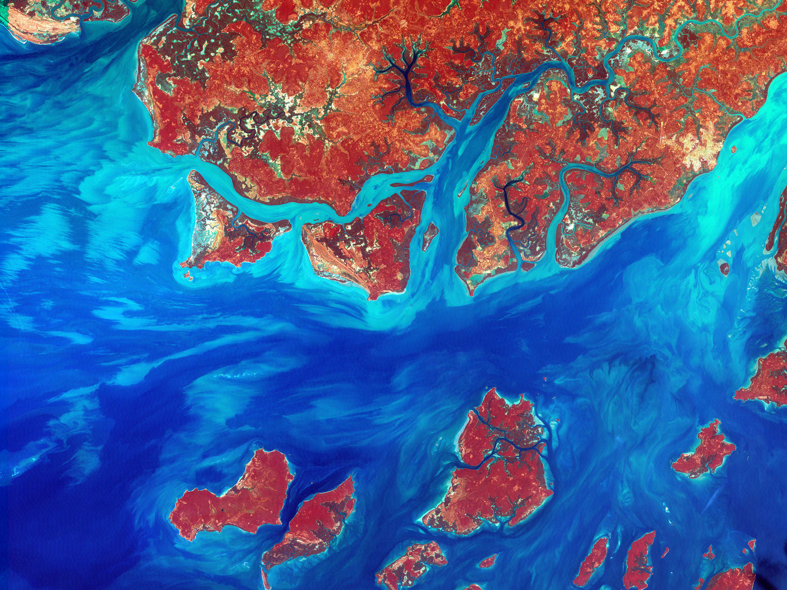 Guinea-Bissau is a small country in West Africa. Complex patterns can be seen in the shallow waters along its coastline, where silt carried by the Geba and other rivers washes out into the Atlantic Ocean. Image taken by Landsat 7 on December 1, 2000.