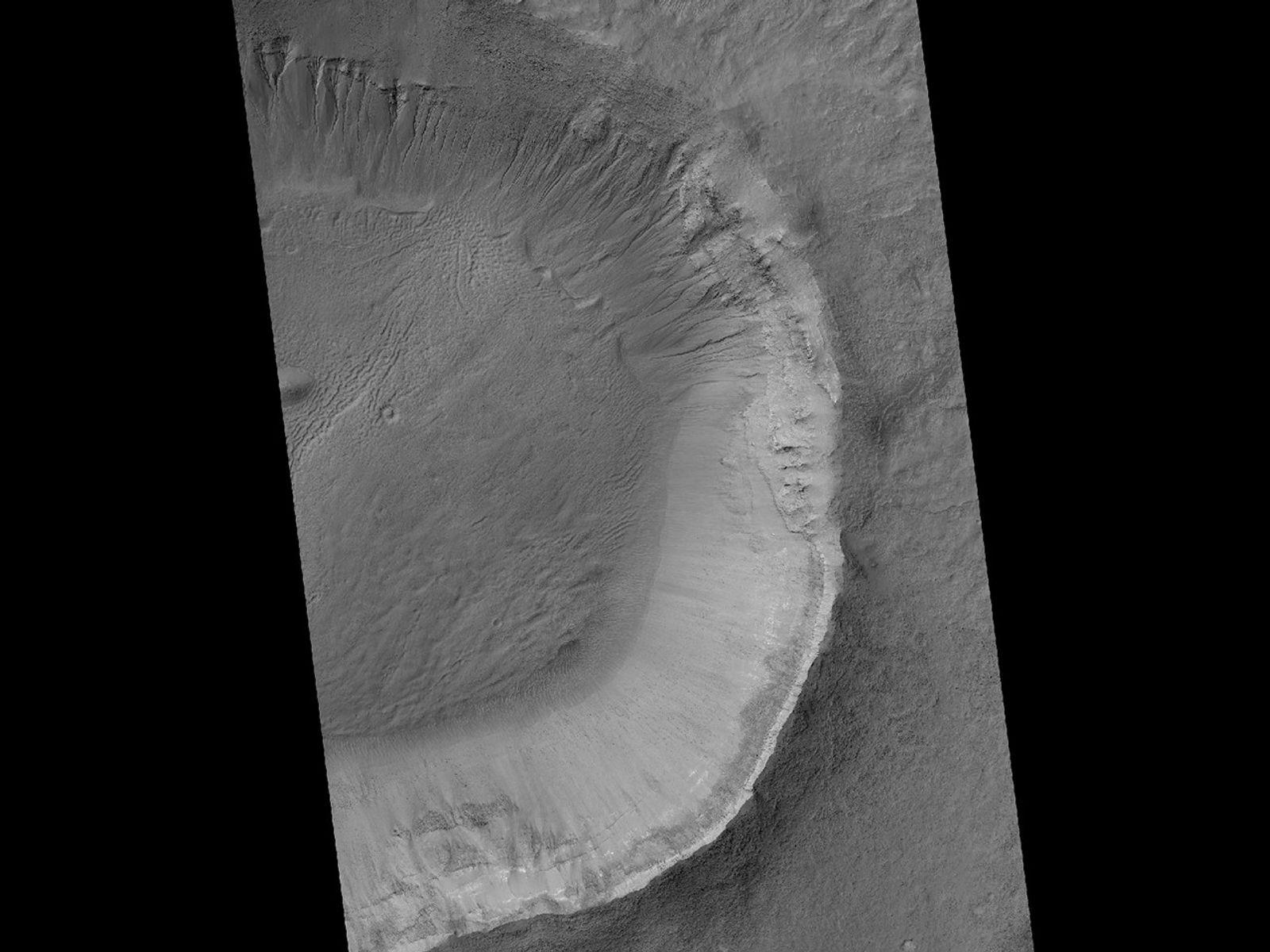 Gullies are typically much larger than the warm-season flows. As seen in this crater, gullies have a typical range of features including alcoves, channels and aprons.