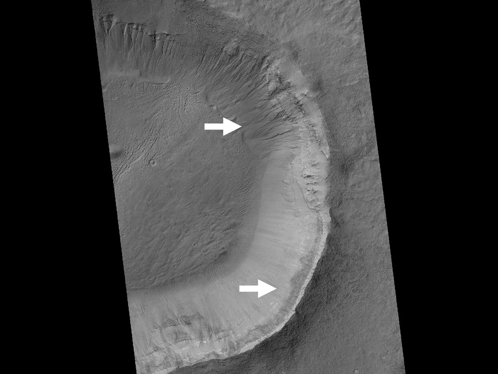 Gullies are on the pole-facing slope, which is on the northern side of this crater (upper arrow). Recurrent warm-season flows are on the equator-facing wall (lower arrow).