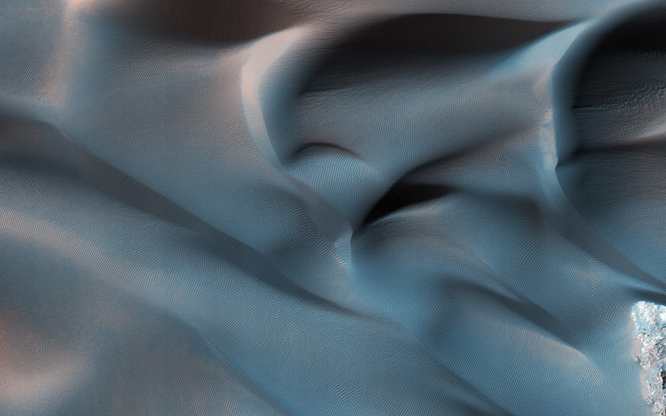 This image was acquired on January 2, 2014, by NASA's Mars Reconnaissance Orbiter. Dune fields located among canyon wall slopes are also known as "wall dune fields" and are further identified as either climbing or falling. Falling dunes are defined as large bedforms with lee faces on the downhill side -- indicating that this is the direction of their migration -- and on moderate slopes greater than 10 to 12 degrees. (A lee face is the downwind side of a dune.)