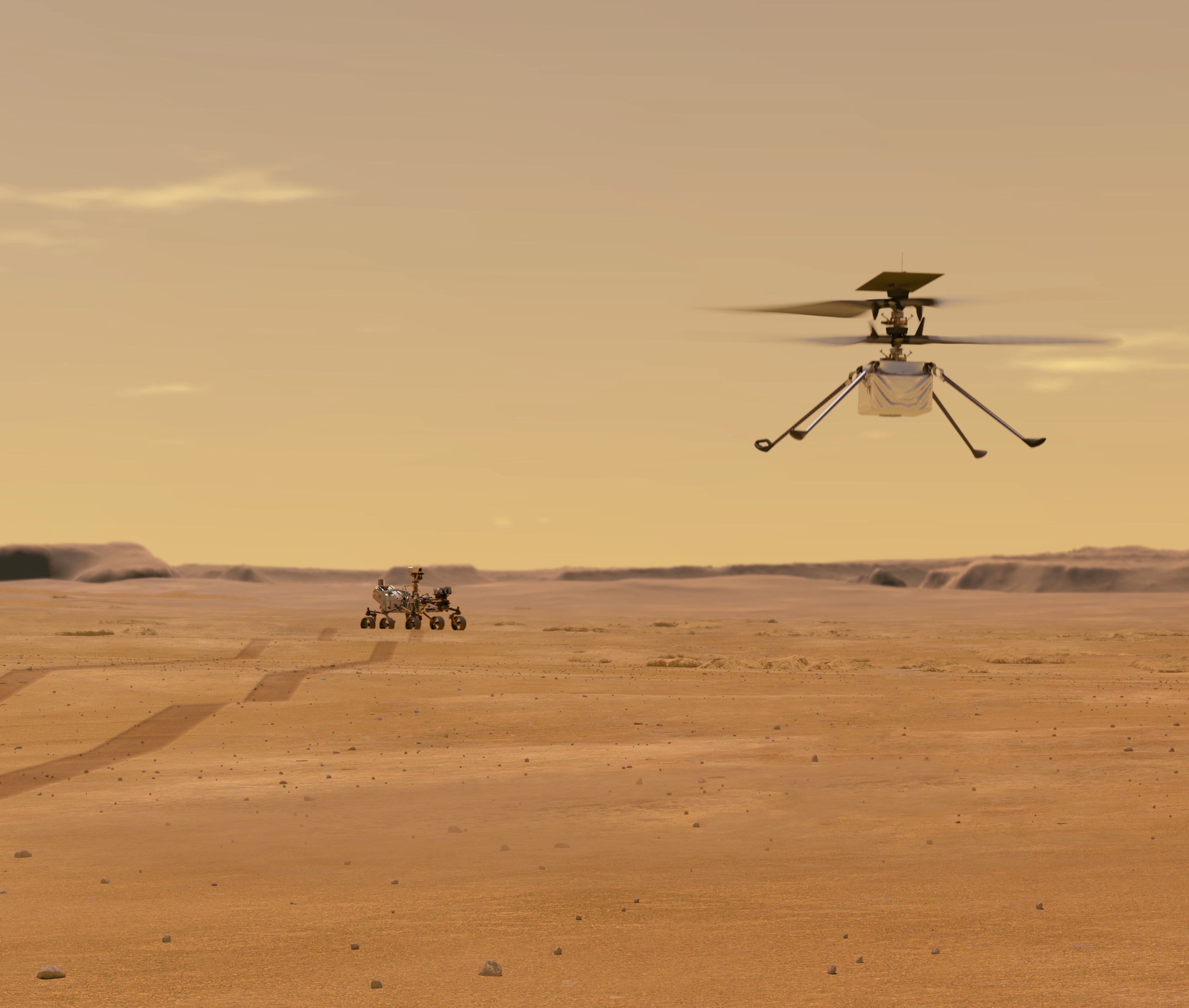Illustration depicts Mars Helicopter Ingenuity during a test flight on Mars. Ingenuity was taken to the Red Planet strapped to the belly of the Perseverance rover (seen in the background).