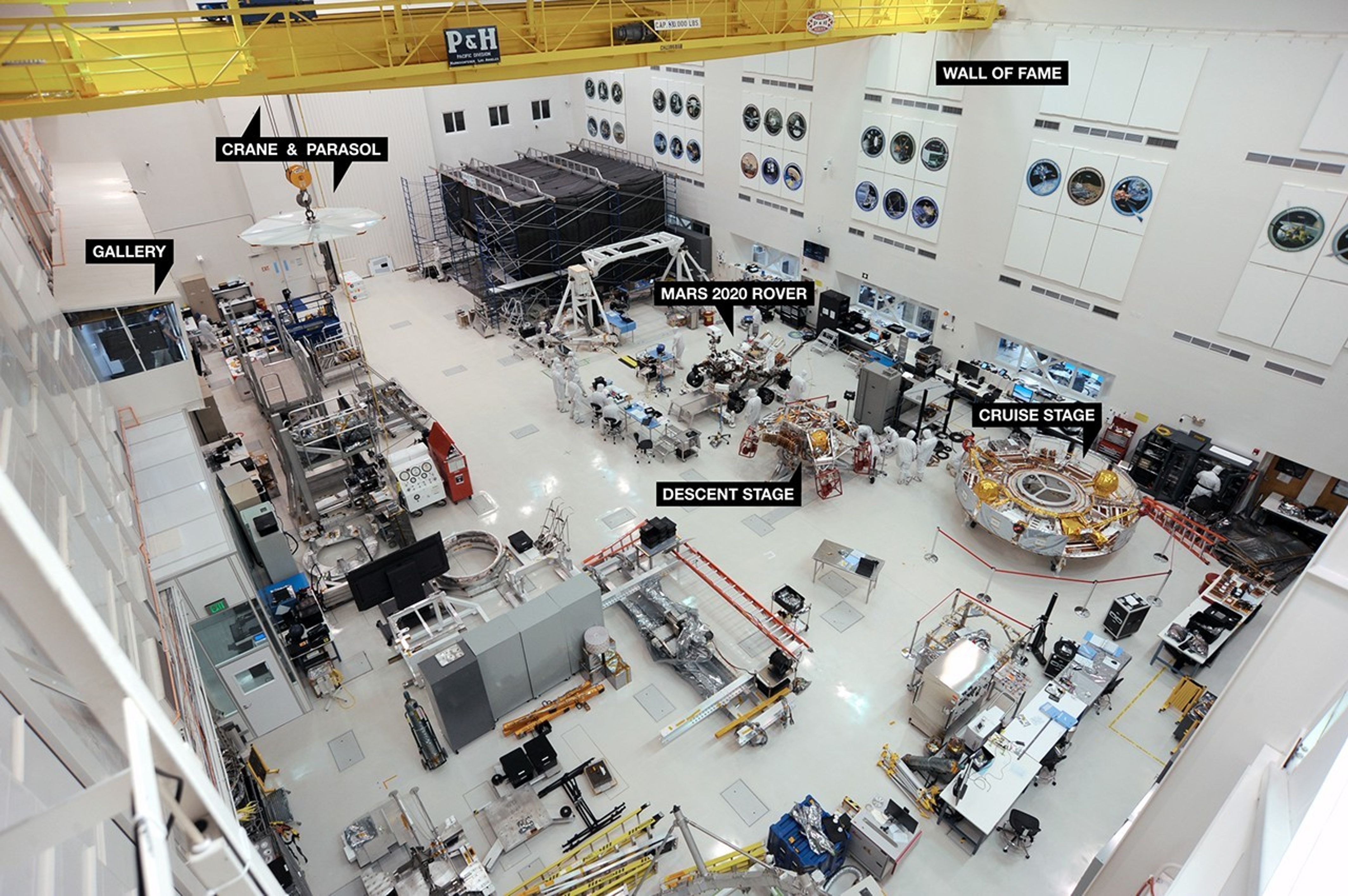 Many of NASA's most famous robotic spacecraft were assembled and tested in High Bay 1, including most of the Ranger and Mariner spacecraft; Voyager 1; the Galileo and Cassini orbiters; and all of NASA's Mars rovers. An annotated version of the image points to the facility's Wall of Fame, featuring emblems of those and other spacecraft that successfully launched after being built in the room. It also points to other features of the room, including the facility's gallery, which hosts about 30,000 members of the public each year.