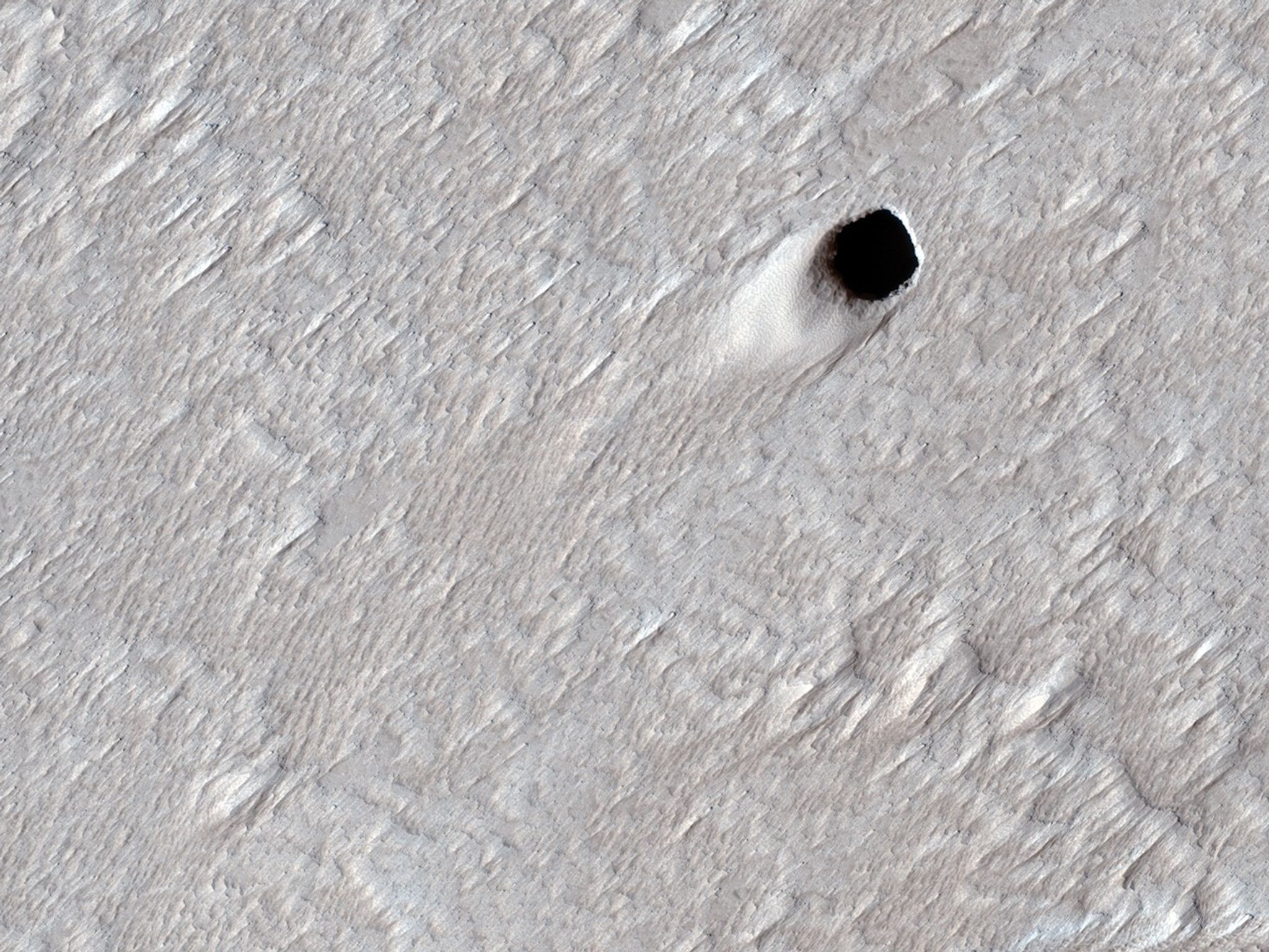 This pit crater was created by an empty lava tube in Mars’ Arsia Mons region. The image was captured by NASA’s Mars Reconnaissance Orbiter on Aug. 16, 2020, using the orbiter’s High-Resolution Imaging Science Experiment, or HiRISE, camera.