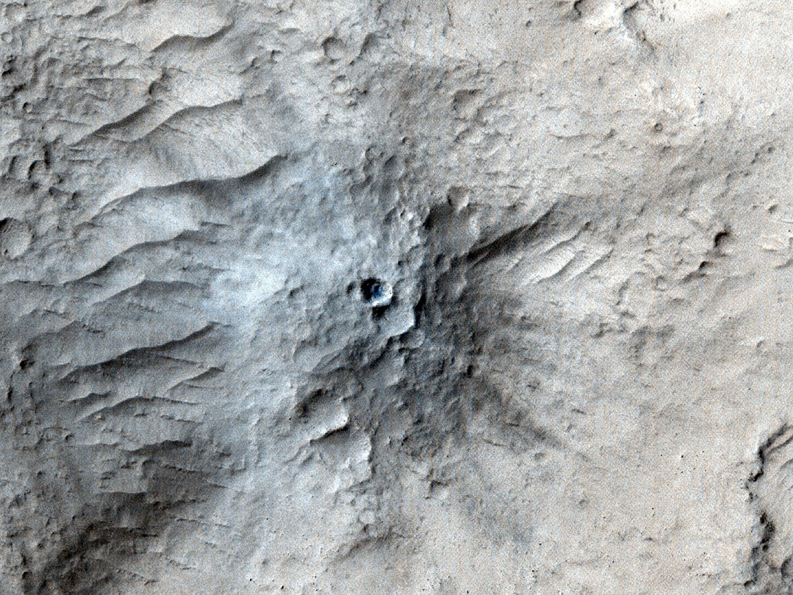 NASA's Mars Reconnaissance Orbiter used its High-Resolution Imaging Science Experiment (HiRISE) camera to capture this impact crater in Cerberus Fossae, a seismically active region of the Red Planet, on March 4, 2021. Scientists matched the crater's appearance on the surface with a quake detected by NASA's InSight lander, which was about 1,000 miles (1,640 kilometers) away. The crater is estimated to be about 71 feet (21.5 meters) in diameter.