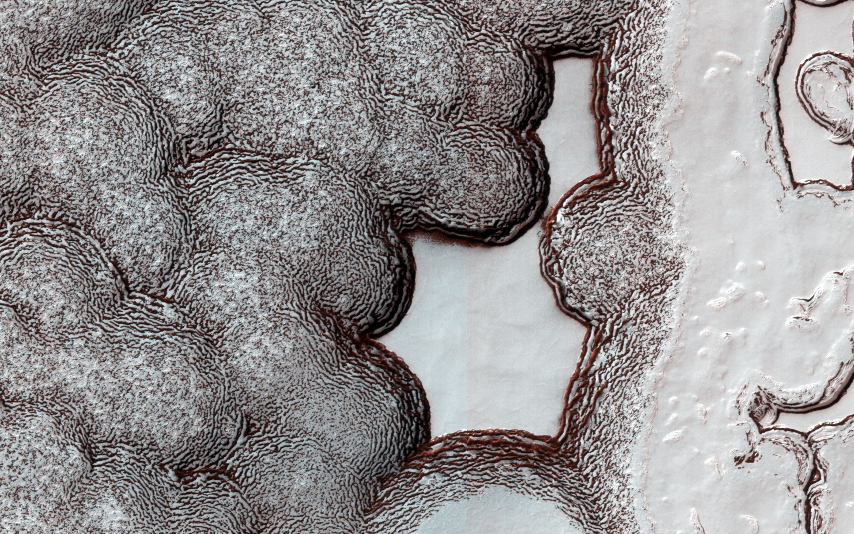 The South Polar residual cap (the part that lasts through the summer) is composed of carbon dioxide ice. Although the cap survives each warm summer season, it is constantly changing its shape due to sublimation of carbon dioxide from steep slopes and deposition onto flat areas.