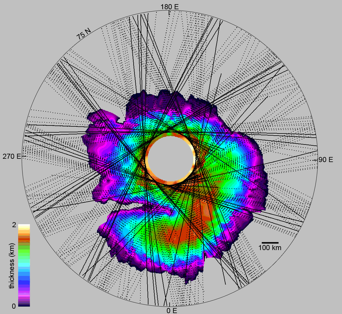 This map shows the thickness of the north polar layered deposits on Mars as measured by the Shallow Radar instrument on NASA's Mars Reconnaissance Orbiter.