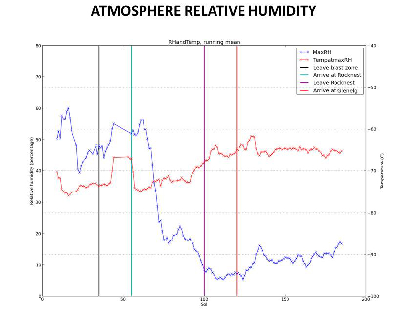 The data are graphed by sol number (starting with Curiosity's landing day as Sol 0), for a period from mid-August 2012 to mid-February 2013, corresponding to late winter through late spring in Mars' southern hemisphere. Four vertical lines on the graph mark progress points of the rover's traverse. While air temperature is not strongly tied to the rover's location, REMS has measured significantly different relative humidity in the different terrain units where the rover has been. All of the sites along the rover's traverse are extremely dry compared with Earth.