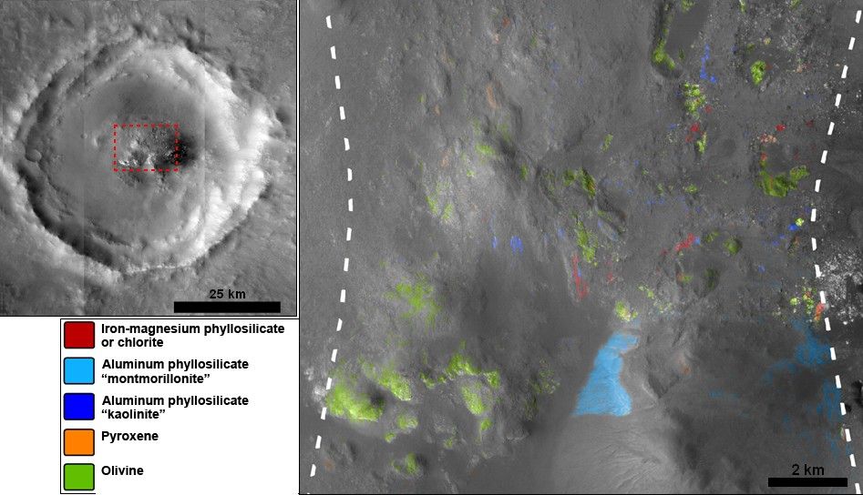 The image on the right shows an area near the center of the crater, with color coding for where CRISM observations have shown exposures of three types of hydrated minerals and nearby exposures of two volcanic minerals unaltered by water: pyroxene and olivine. The scale bar is 2 kilometers (1.2 miles).