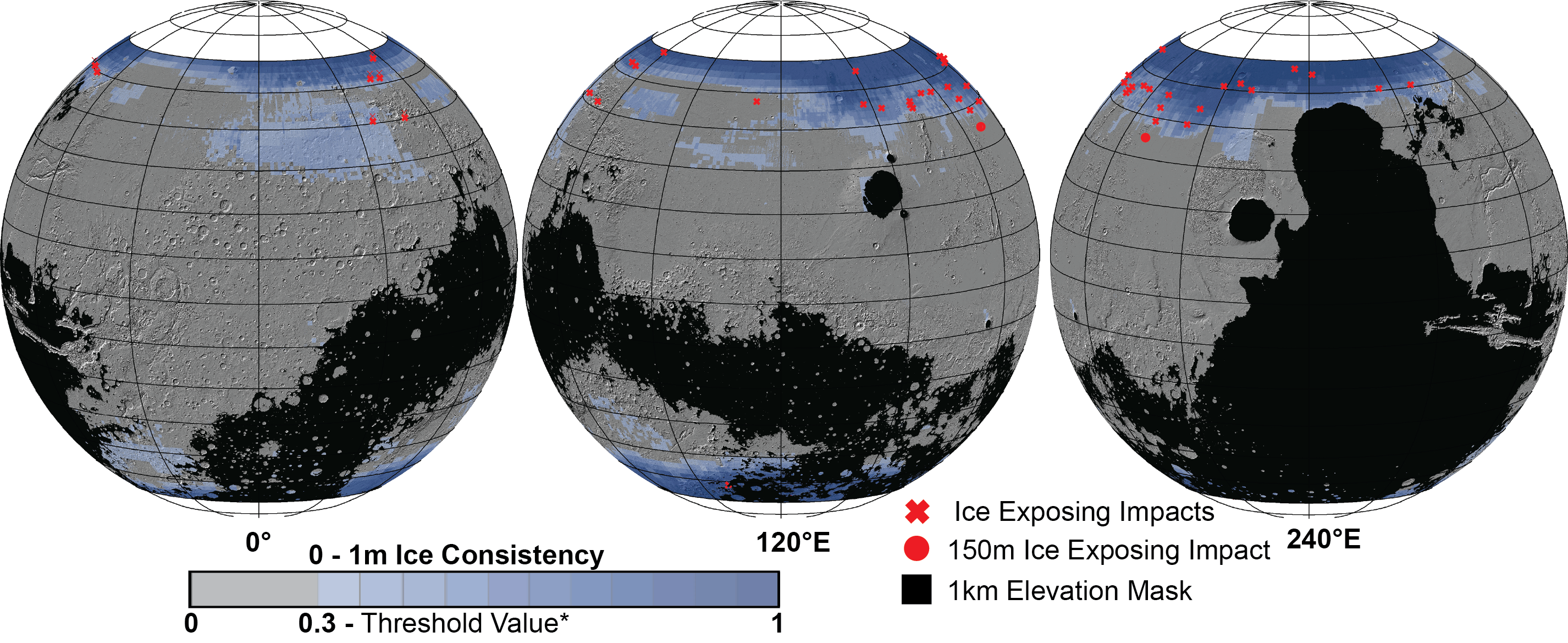 Most of these craters are no more than 33 feet (10 meters) in diameter, although in 2022 HiRISE captured a 492-foot-wide (150-meter-wide) impact crater that revealed a motherlode of ice that had been hiding beneath the surface. This crater is indicated with a circle in the upper-left portion of the right-most globe above.