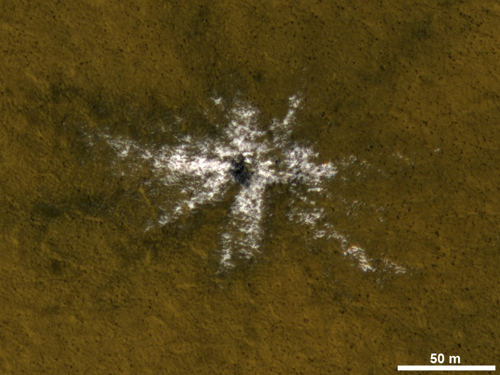 This image taken on May 19, 2010, shows an impact crater that had not existed when the same location on Mars was previously observed in March 2008. The new impact excavated and scattered water ice that had been hidden beneath the surface. The location is at 63.9 degrees north latitude, 44.9 degrees east longitude. The 50-meter scale bar at lower right is about 55 yards long.