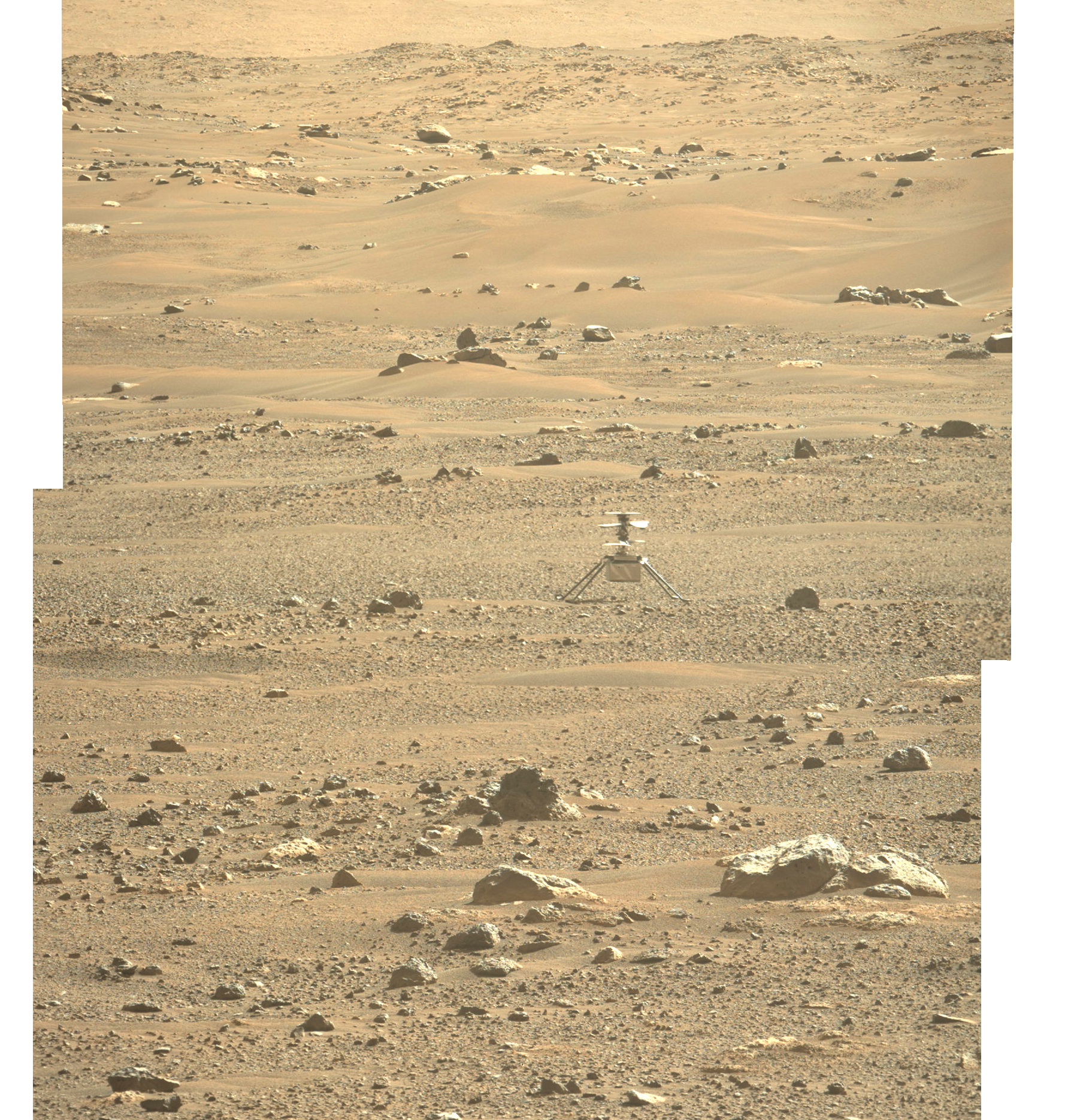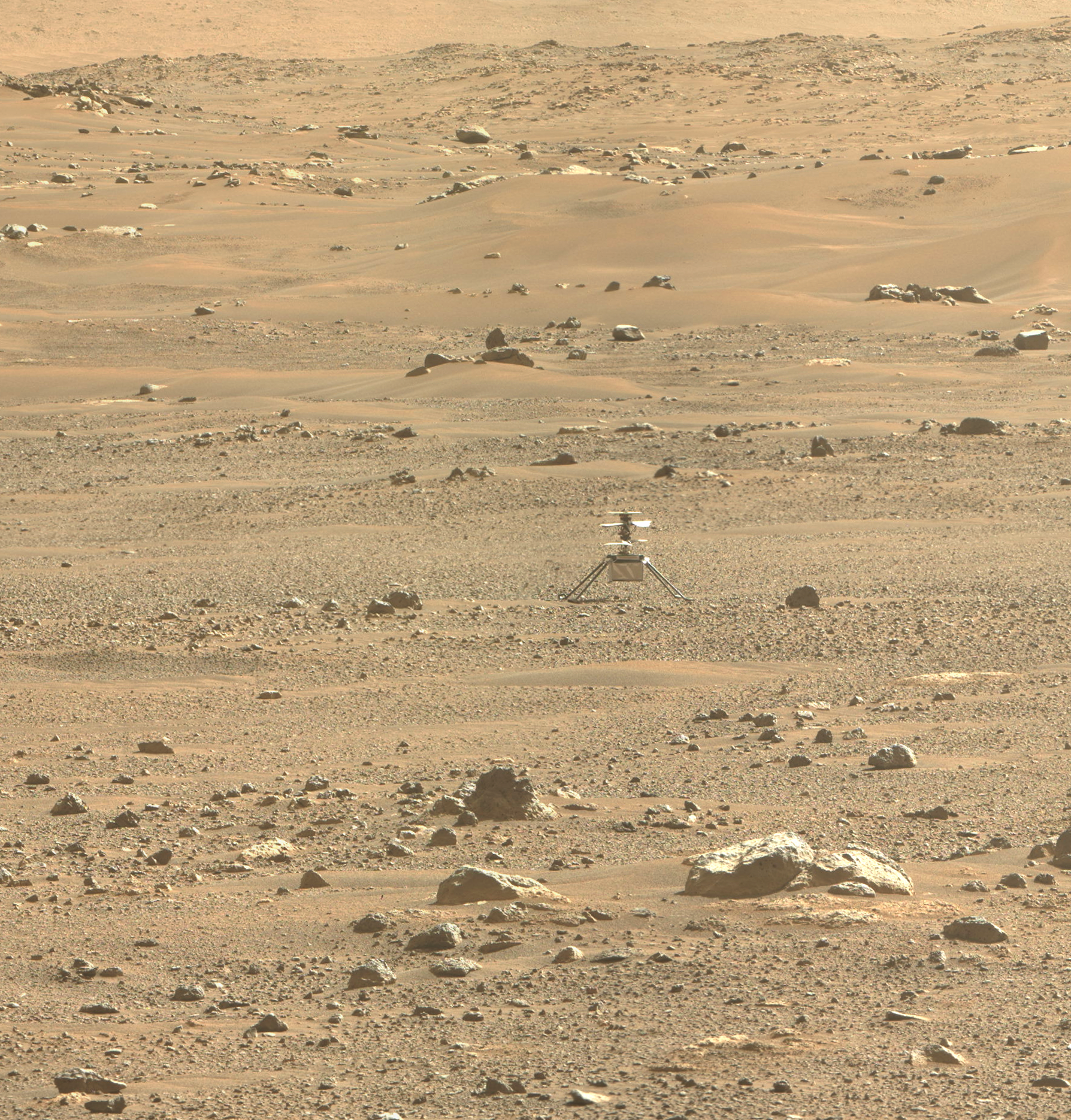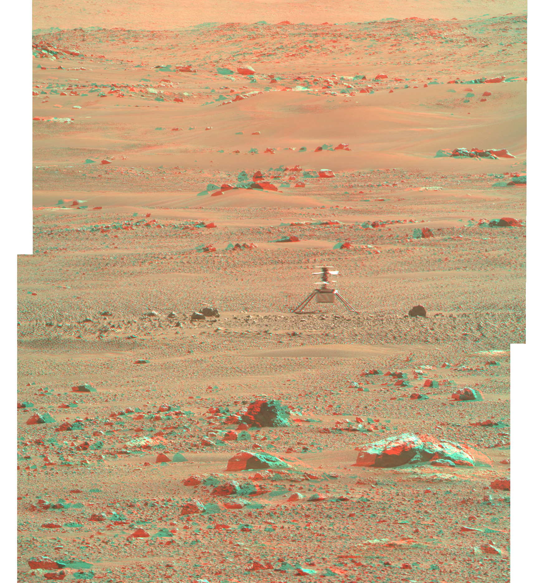 NASA’s Ingenuity Mars Helicopter is seen here in 3D using images taken June 6, 2021 (the 105 the Martian day, or sol, of the mission), by the left and right Mastcam-Z cameras aboard NASA’s Perseverance Mars rover.